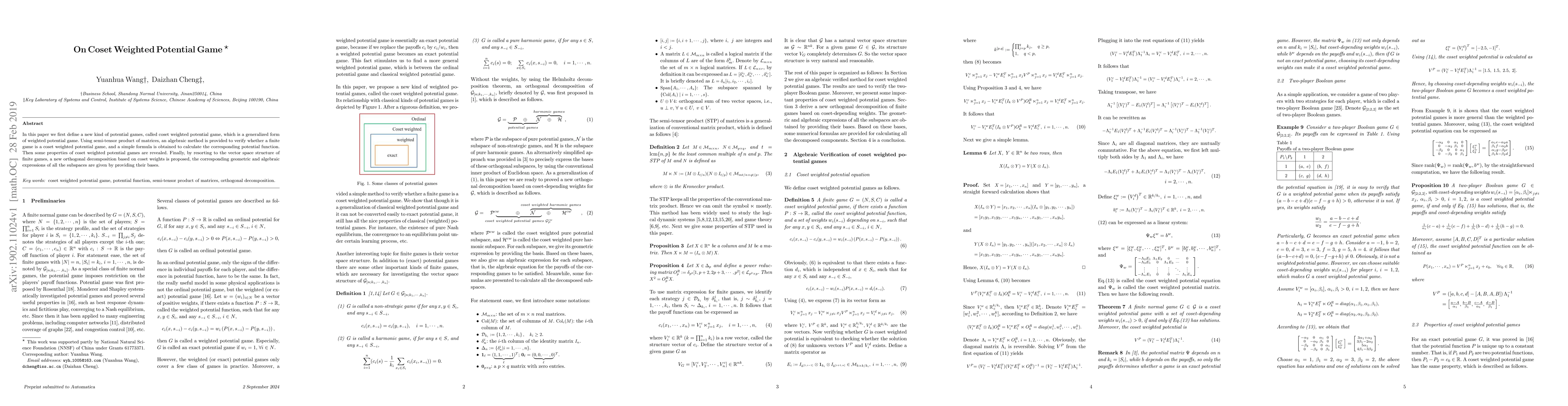 In this paper we first define a new kind of potential games, called coset weighted potential game, which is a generalized form of weighted potential game. Using semi-tensor product of matrices, an algebraic method is provided to verify whether a finite game is a coset weighted potential game, and a simple formula is obtained to calculate the corresponding potential function. Then some properties of coset weighted potential games are revealed. Finally, by resorting to the vector space structure of finite games, a new orthogonal decomposition based on coset weights is proposed, the corresponding geometric and algebraic expressions of all the subspaces are given by providing their bases.