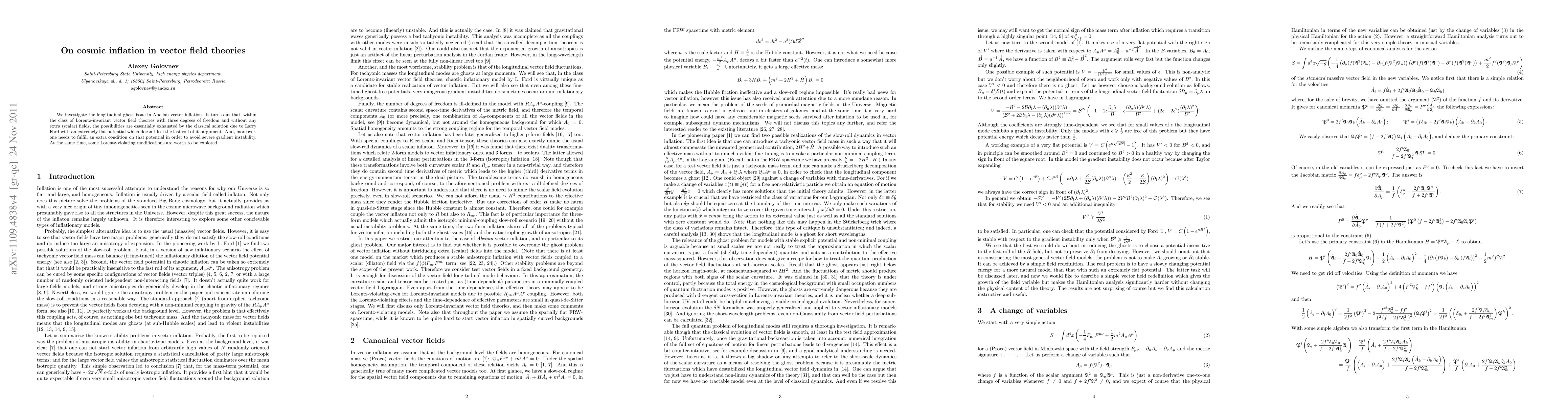 We investigate the longitudinal ghost issue in Abelian vector inflation. It turns out that, within the class of Lorentz-invariant vector field theories with three degrees of freedom and without any extra (scalar) fields, the possibilities are essentially exhausted by the classical solution due to Larry Ford with an extremely flat potential which doesn't feel the fast roll of its argument. And, moreover, one needs to fulfil an extra condition on that potential in order to avoid severe gradient instability. At the same time, some Lorentz-violating modifications are worth to be explored.