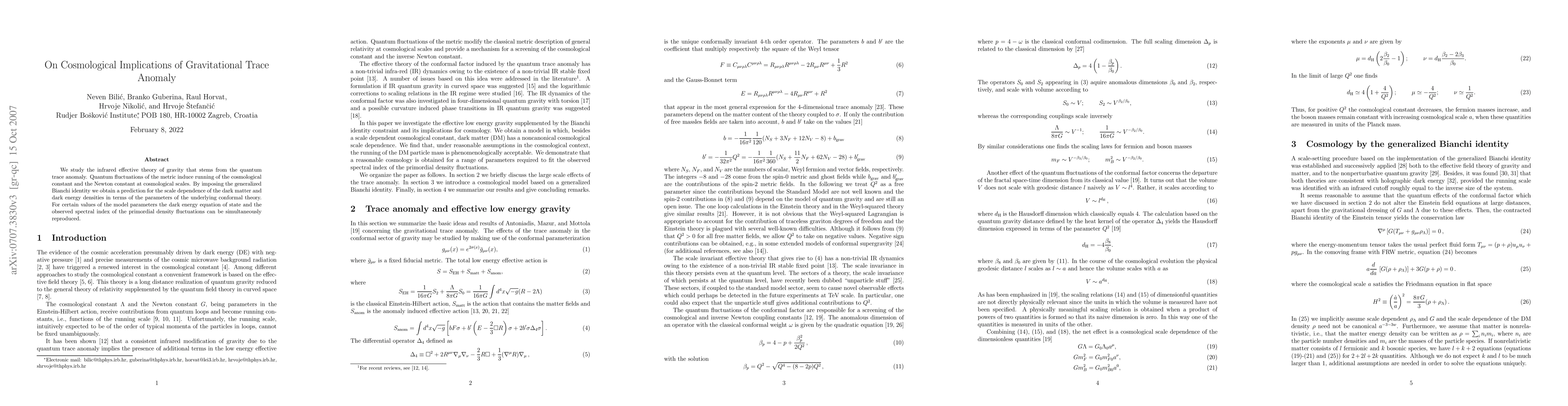 We study the infrared effective theory of gravity that stems from the quantum trace anomaly. Quantum fluctuations of the metric induce running of the cosmological constant and the Newton constant at cosmological scales. By imposing the generalized Bianchi identity we obtain a prediction for the scale dependence of the dark matter and dark energy densities in terms of the parameters of the underlying conformal theory. For certain values of the model parameters the dark energy equation of state and the observed spectral index of the primordial density fluctuations can be simultaneously reproduced.