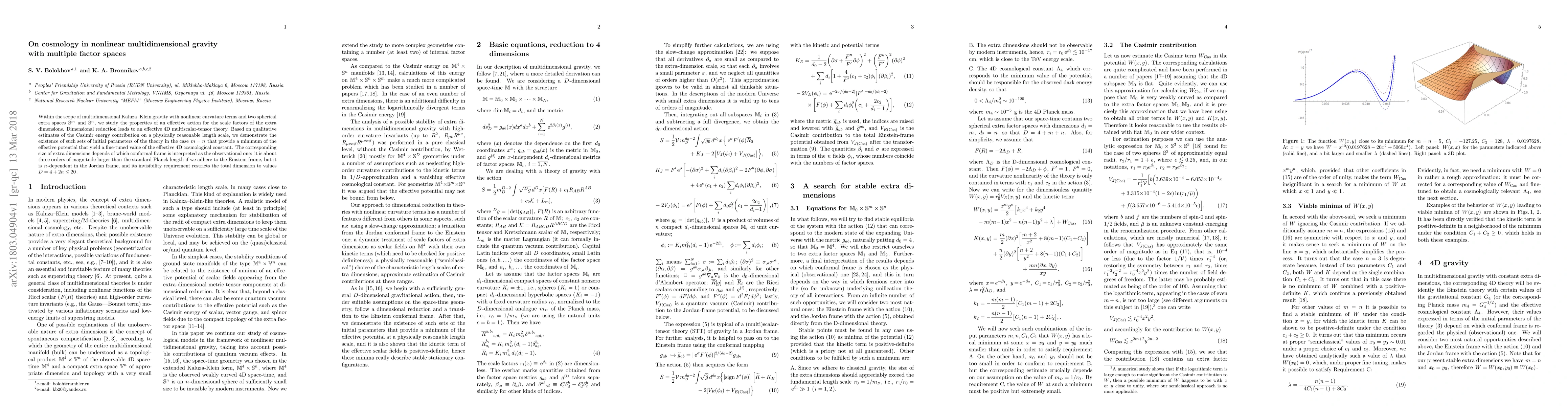 Within the scope of multidimensional Kaluza--Klein gravity with nonlinear curvature terms and two spherical extra spaces of dimensions $m$ and $n$, we study the properties of an effective action for the scale factors of the extra dimensions. Dimensional reduction leads to an effective 4D multiscalar-tensor theory. Based on qualitative estimates of the Casimir energy contribution on a physically reasonable length scale, we demonstrate the existence of such sets of initial parameters of the theory in the case $m=n$ that provide a minimum of the effective potential that yield a fine-tuned value of the effective 4D cosmological constant. The corresponding size of extra dimensions depends of which conformal frame is interpreted as the observational one: it is about three orders of magnitude larger than the standard Planck length if we adhere to the Einstein frame, but it is $n$-dependent in the Jordan frame, and its invisibility requirement restricts the total dimension to values $D = 4+2n \leq 20$.