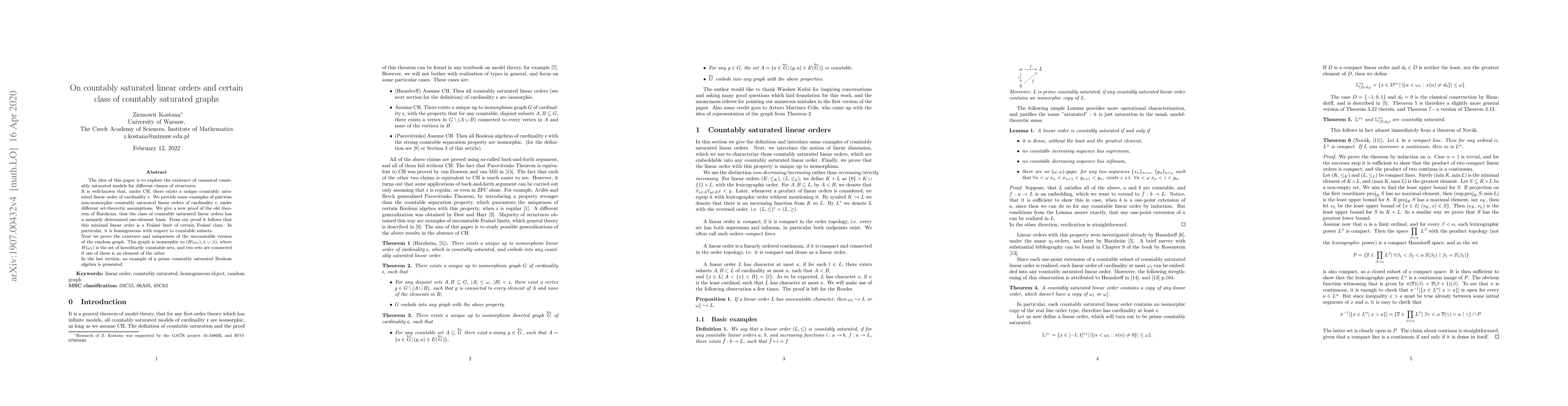 The idea of this paper is to explore the existence of canonical countably saturated models for different classes of structures. It is well-known that, under CH, there exists a unique countably saturated linear order of cardinality $\mathfrak{c}$. We provide some examples of pairwise non-isomorphic countably saturated linear orders of cardinality $\mathfrak{c}$, under different set-theoretic assumptions. We give a new proof of the old theorem of Harzheim, that the class of countably saturated linear orders has a uniquely determined one-element basis. From our proof it follows that this minimal linear order is a Fra\"isse limit of certain Fra\"isse class. In particular, it is homogeneous with respect to countable subsets. Next, we prove the existence and uniqueness of the uncountable version of the random graph. This graph is isomorphic to $(H(\omega_1),\in \cup \ni)$, where $H(\omega_1)$ is the set of hereditarily countable sets, and two sets are connected if one of them is an element of the other. In the last section, an example of a prime countably saturated Boolean algebra is presented.