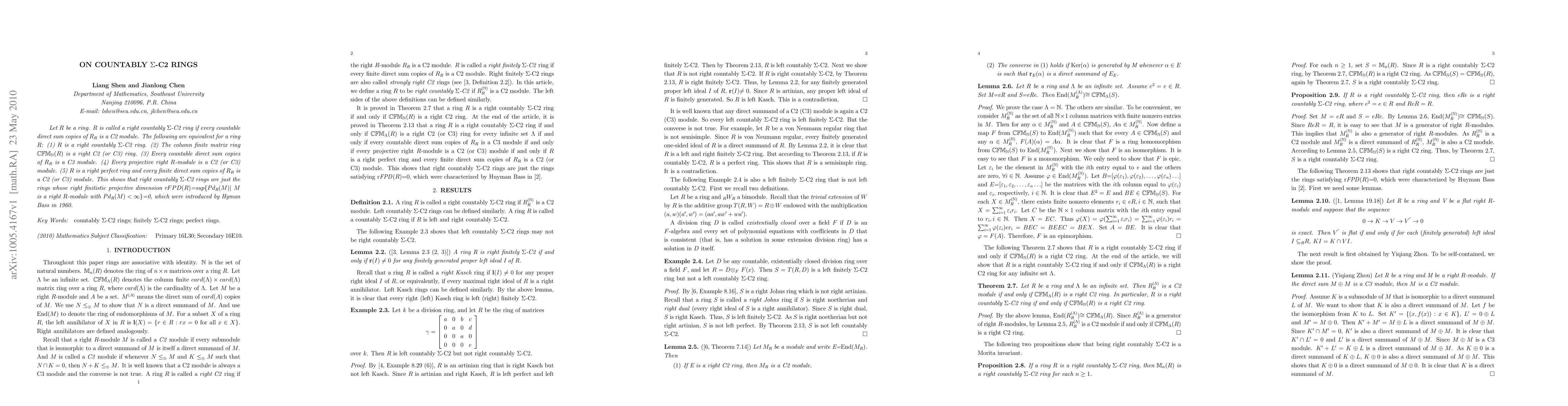 Let $R$ be a ring. $R$ is called a right countably $\Sigma$-C2 ring if every countable direct sum copies of $R_{R}$ is a C2 module. The following are equivalent for a ring $R$: (1) $R$ is a right countably $\Sigma$-C2 ring. (2) The column finite matrix ring $\mathbb{C}\mathbb{F}\mathbb{M}_{\mathbb{N}}(R)$ is a right C2 (or C3) ring. (3) Every countable direct sum copies of $R_{R}$ is a C3 module. (4) Every projective right $R$-module is a C2 (or C3) module. (5) $R$ is a right perfect ring and every finite direct sum copies of $R_{R}$ is a C2 (or C3) module. This shows that right countably $\Sigma$-C2 rings are just the rings whose right finitistic projective dimension r$FPD(R)$=sup\{$Pd_{R}(M)|$ $M$ is a right $R$-module with $Pd_{R}(M)<\infty$\}=0, which were introduced by Hyman Bass in 1960.