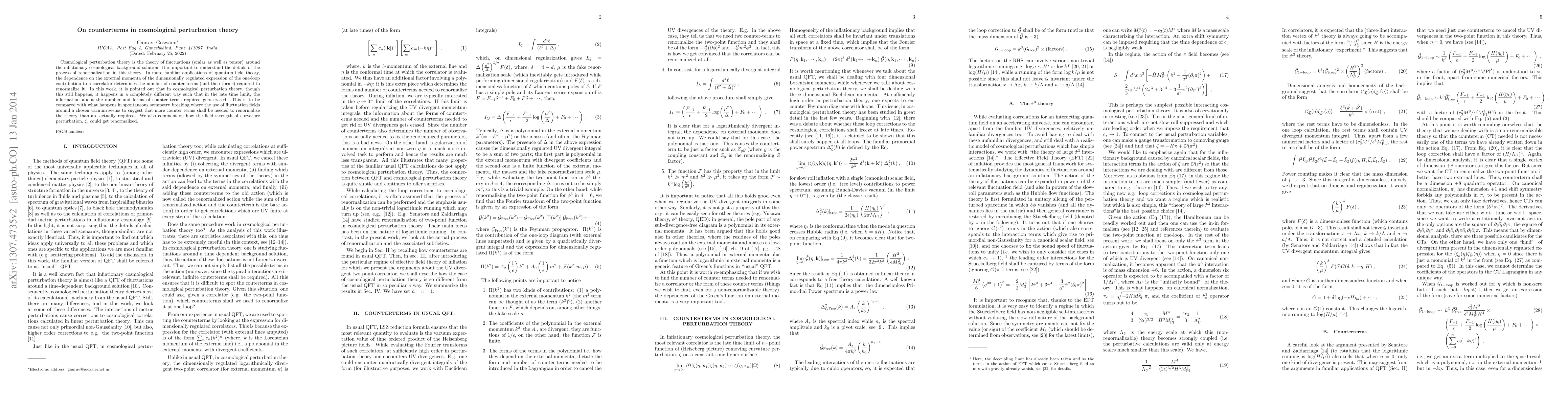 Cosmological perturbation theory is the theory of fluctuations (scalar as well as tensor) around the inflationary cosmological background solution. It is important to understand the details of the process of renormalization in this theory. In more familiar applications of quantum field theory, the dependence on the external momenta of the dimensionally regulated expression of the one-loop contribution to a correlator determines the number of counter terms (and their forms) required to renormalize it. In this work, it is pointed out that in cosmological perturbation theory, though this still happens, it happens in a completely different way such that in the late time limit, the information about the number and forms of counter terms required gets erased. This is to be compared with what happens in spontaneous symmetry breaking where the use of fluctuation fields around a chosen vacuum seems to suggest that more counter terms shall be needed to renormalize the theory than are actually required. We also comment on how the field strength of curvature perturbation, $\zeta$, could get renormalized.