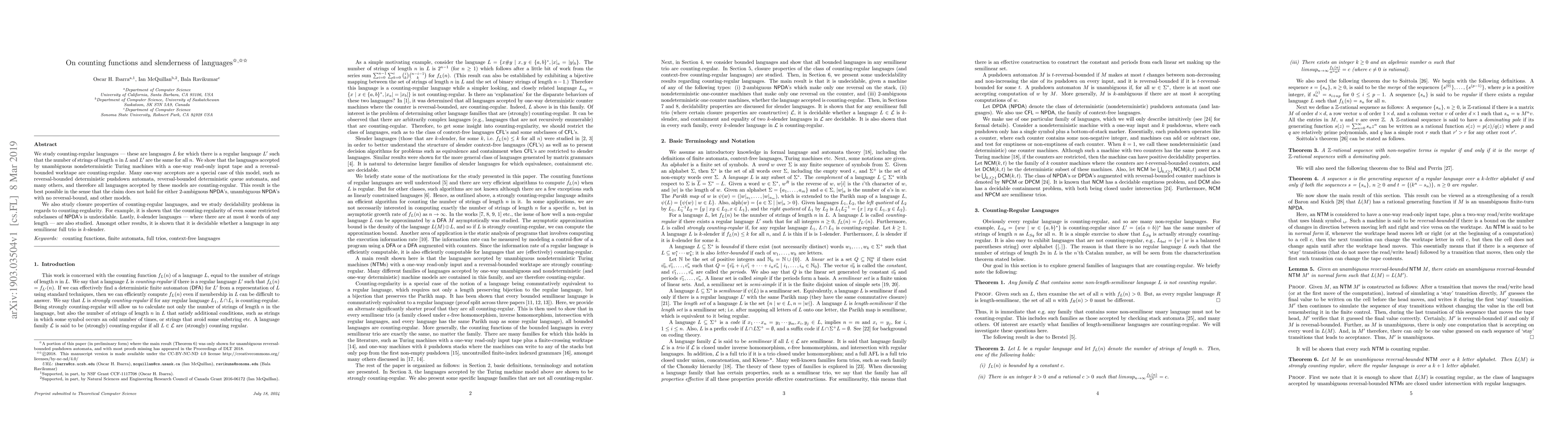 This paper investigates counting-regular languages, proving that those accepted by unambiguous nondeterministic Turing machines with specific constraints are counting-regular. It also explores the undecidability of counting-regularity in certain subclasses of pushdown automata and examines the properties of $k$-slender languages, showing decidability for semilinear full trios.