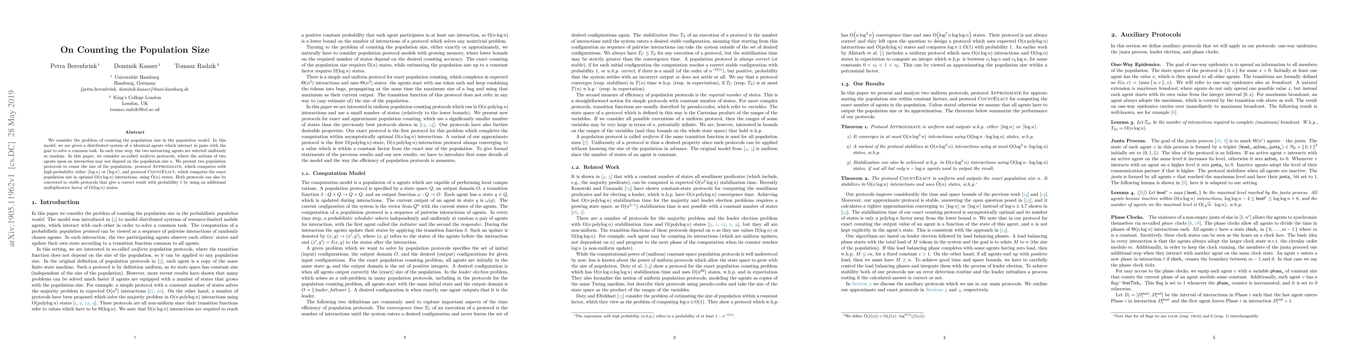 This paper presents two population protocols for counting the size of a distributed system of identical agents: Approximate, which estimates $\log n$ with high probability, and CountExact, which computes the exact population size with optimal efficiency. Both protocols can be converted to stable versions ensuring exact results.