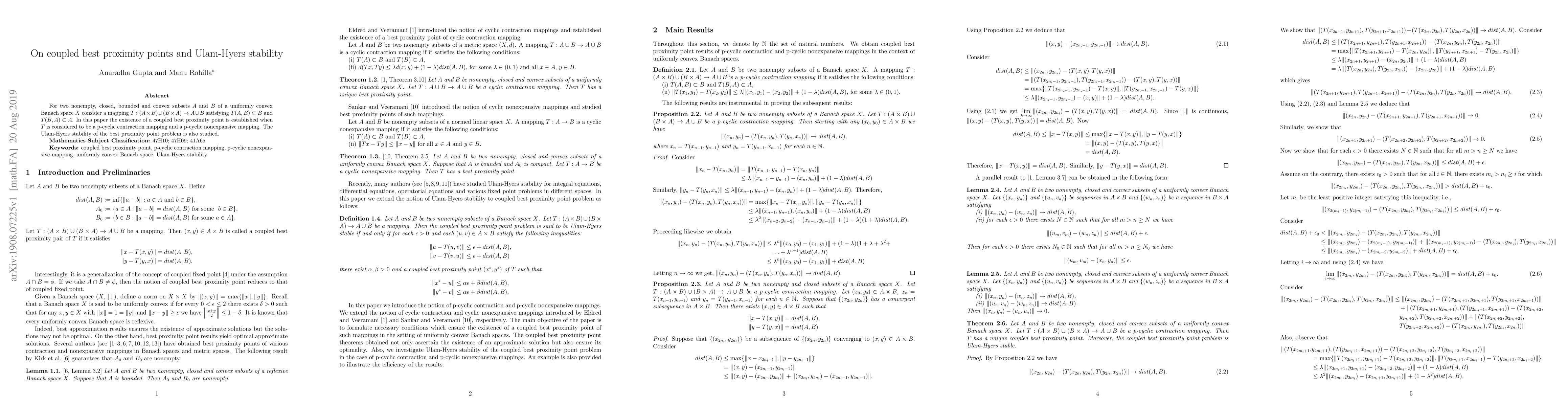 For two nonempty, closed, bounded and convex subsets $A$ and $B$ of a uniformly convex Banach space $X$ consider a mapping $T:(A \times B) \cup (B \times A) \rightarrow A \cup B$ satisfying $T(A,B) \subset B$ and $T(B, A) \subset A$. In this paper the existence of a coupled best proximity point is established when $T$ is considered to be a p-cyclic contraction mapping and a p-cyclic nonexpansive mapping. The Ulam-Hyers stability of the best proximity point problem is also studied.