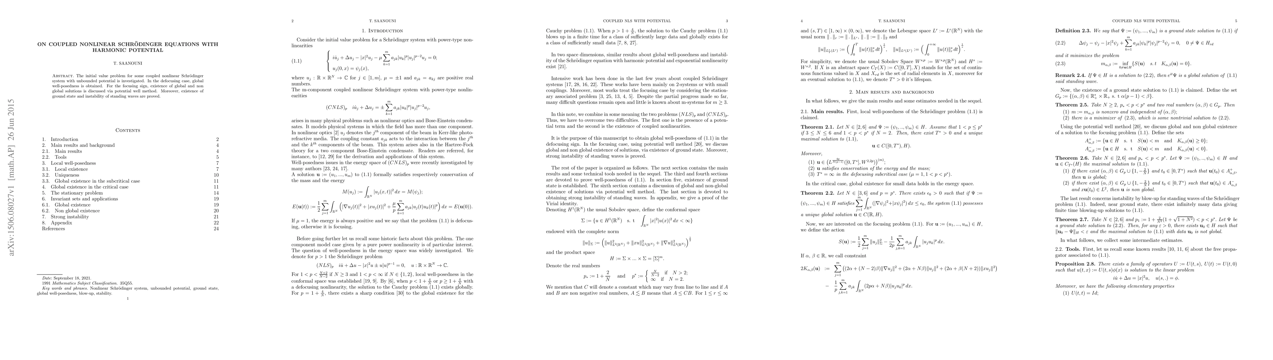 A research paper investigates coupled nonlinear Schrodinger equations with harmonic potential, proving global well-posedness in the defocusing case and existence of ground states, while discussing solution existence and instability for the focusing sign.