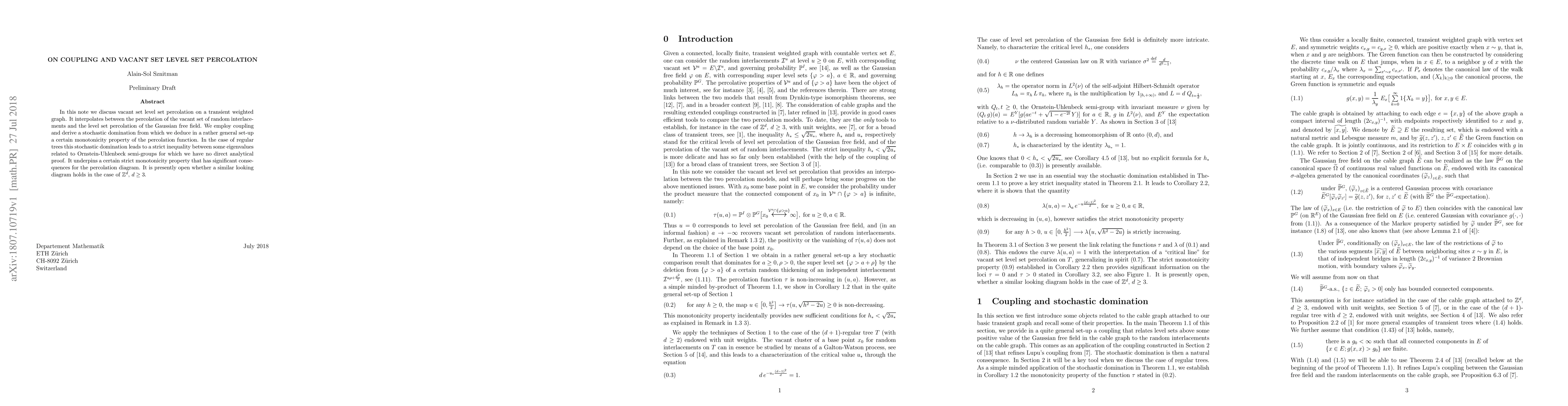 In this note we discuss vacant set level set percolation on a transient weighted graph. It interpolates between the percolation of the vacant set of random interlacements and the level set percolation of the Gaussian free field. We employ coupling and derive a stochastic domination from which we deduce in a rather general set-up a certain monotonicity property of the percolation function. In the case of regular trees this stochastic domination leads to a strict inequality between some eigenvalues related to Ornstein-Uhlenbeck semi-groups for which we have no direct analytical proof. It underpins a certain strict monotonicity property that has significant consequences for the percolation diagram. It is presently open whether a similar looking diagram holds in the case of Z^d, with d bigger or equal to 3.