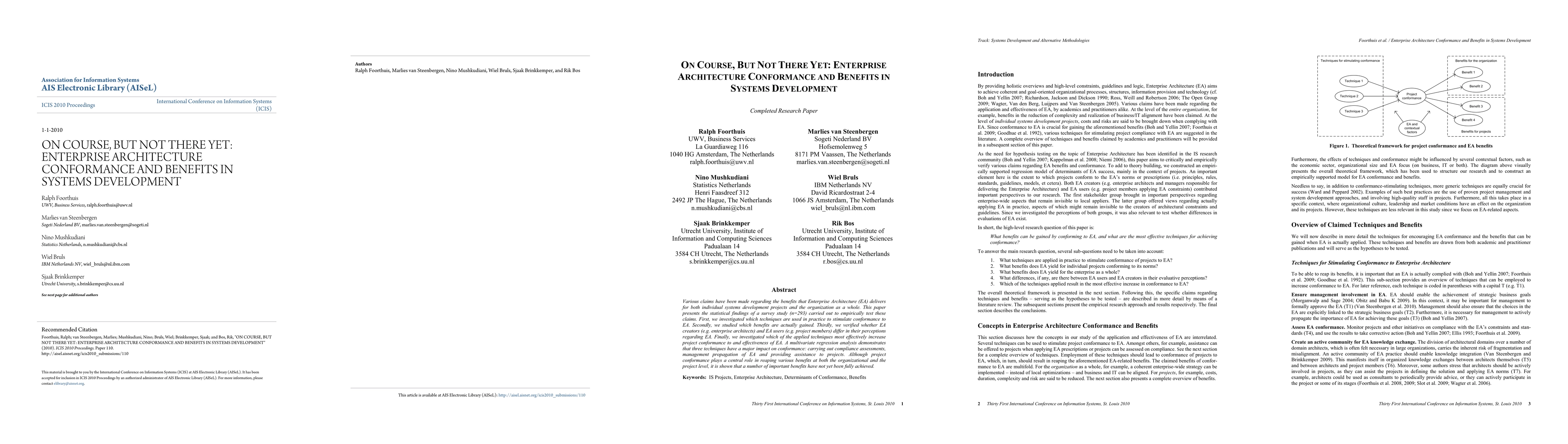 This paper investigates the techniques used to enhance Enterprise Architecture (EA) conformance in systems development and the benefits realized. It finds that compliance assessments, management propagation, and project assistance significantly boost conformance, but not all expected benefits have been fully realized.