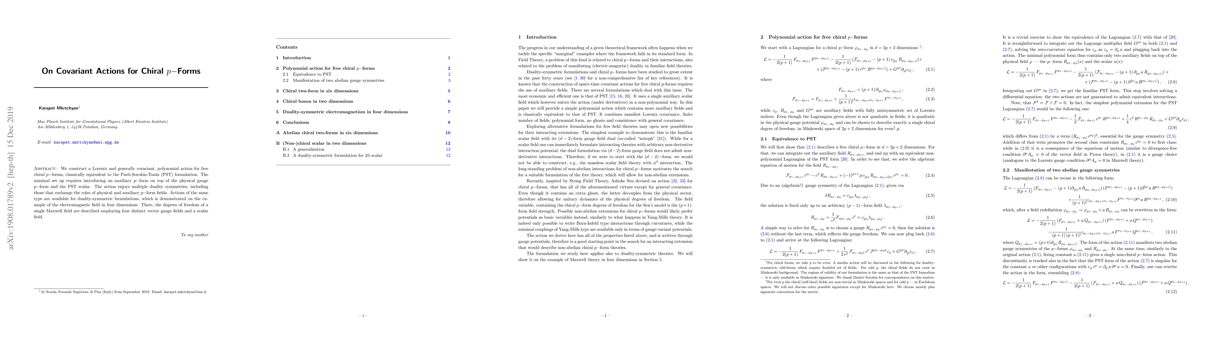 We construct a Lorentz and generally covariant, polynomial action for free chiral $p-$forms, classically equivalent to the Pasti-Sorokin-Tonin (PST) formulation. The minimal set up requires introducing an auxiliary $p-$form on top of the physical gauge $p-$form and the PST scalar. The action enjoys multiple duality symmetries, including those that exchange the roles of physical and auxiliary $p-$form fields. Actions of the same type are available for duality-symmetric formulations, which is demonstrated on the example of the electromagnetic field in four dimensions. There, the degrees of freedom of a single Maxwell field are described employing four distinct vector gauge fields and a scalar field.