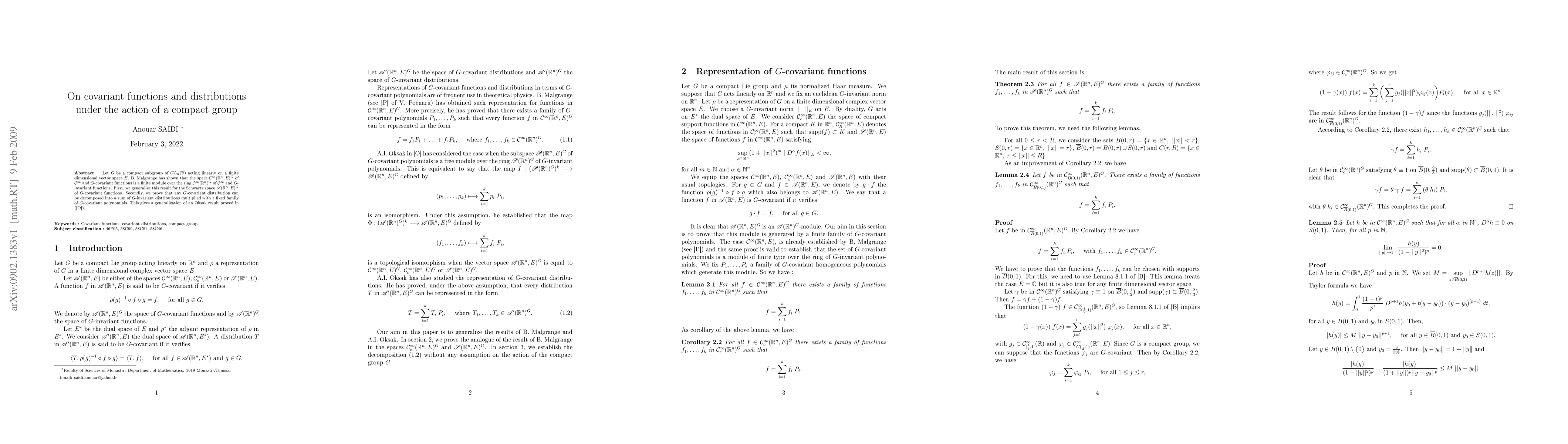 Let $G$ be a compact subgroup of $GL_n(\R)$ acting linearly on a finite dimensional vector space $E$. B. Malgrange has shown that the space $\mathcal{C}^\infty(\R^n,E)^G$ of $\mathcal{C}^\infty$ and $G$-covariant functions is a finite module over the ring $\mathcal{C}^\infty(\R^n)^G$ of $\mathcal{C}^\infty$ and $G$-invariant functions. First, we generalize this result for the Schwartz space $\mathscr{S}(\R^n,E)^G$ of $G$-covariant functions. Secondly, we prove that any $G$-covariant distribution can be decomposed into a sum of $G$-invariant distributions multiplied with a fixed family of $G$-covariant polynomials. This gives a generalization of an Oksak result proved in ([O]).