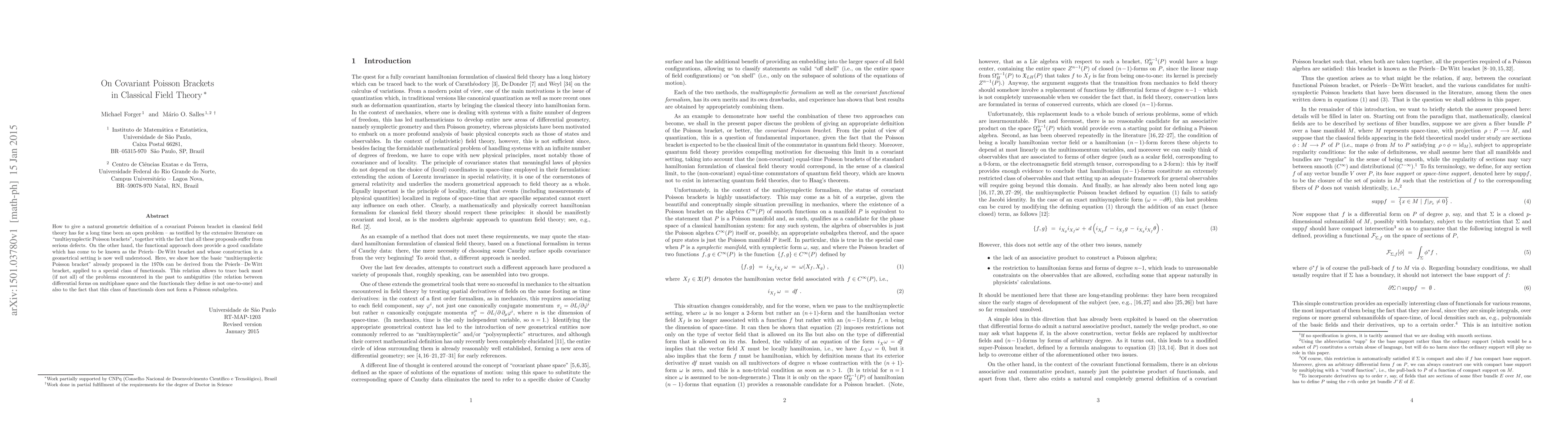 How to give a natural geometric definition of a covariant Poisson bracket in classical field theory has for a long time been an open problem - as testified by the extensive literature on "multisymplectic Poisson brackets", together with the fact that all these proposals suffer from serious defects. On the other hand, the functional approach does provide a good candidate which has come to be known as the Peierls - De Witt bracket and whose construction in a geometrical setting is now well understood. Here, we show how the basic "multisymplectic Poisson bracket" already proposed in the 1970s can be derived from the Peierls - De Witt bracket, applied to a special class of functionals. This relation allows to trace back most (if not all) of the problems encountered in the past to ambiguities (the relation between differential forms on multiphase space and the functionals they define is not one-to-one) and also to the fact that this class of functionals does not form a Poisson subalgebra.