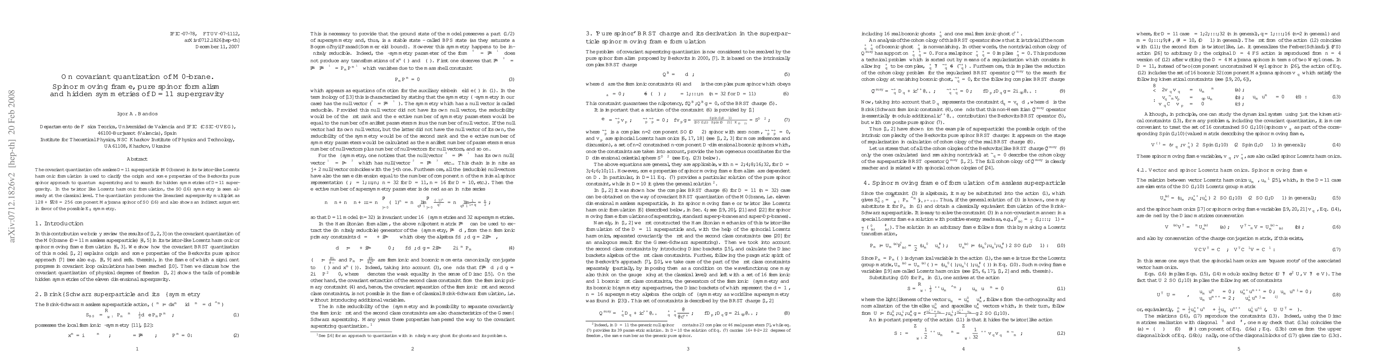 This paper explores the covariant quantization of the M0-brane in D=11 supergravity, utilizing the twistor-like Lorentz harmonic formulation to reveal the classical SO(16) symmetry and potential E8 symmetry, while demonstrating the Berkovits pure spinor approach to quantum superstring theory.