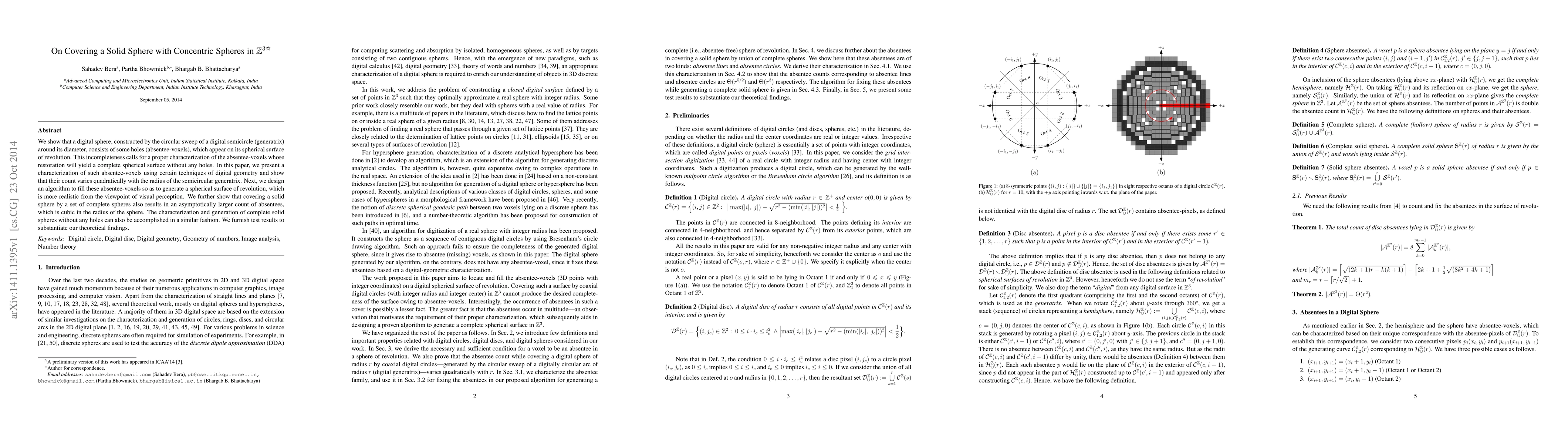 We show that a digital sphere, constructed by the circular sweep of a digital semicircle (generatrix) around its diameter, consists of some holes (absentee-voxels), which appear on its spherical surface of revolution. This incompleteness calls for a proper characterization of the absentee-voxels whose restoration will yield a complete spherical surface without any holes. In this paper, we present a characterization of such absentee-voxels using certain techniques of digital geometry and show that their count varies quadratically with the radius of the semicircular generatrix. Next, we design an algorithm to fill these absentee-voxels so as to generate a spherical surface of revolution, which is more realistic from the viewpoint of visual perception. We further show that covering a solid sphere by a set of complete spheres also results in an asymptotically larger count of absentees, which is cubic in the radius of the sphere. The characterization and generation of complete solid spheres without any holes can also be accomplished in a similar fashion. We furnish test results to substantiate our theoretical findings.