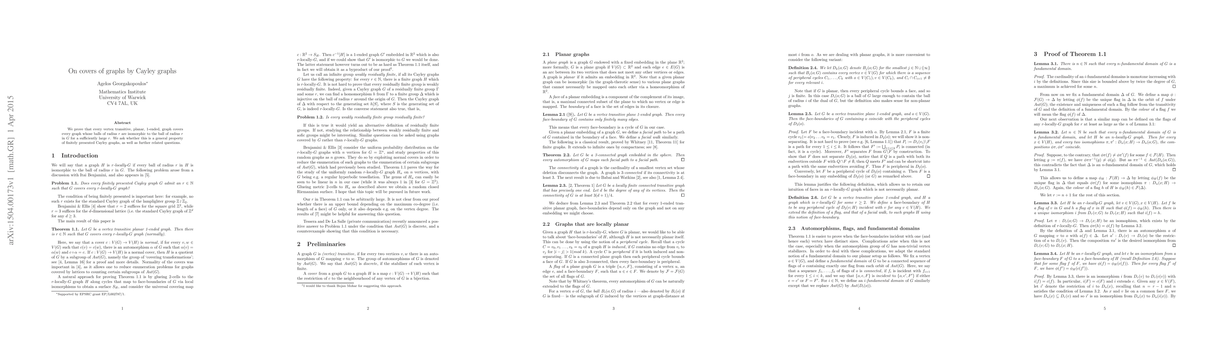 We prove that every vertex transitive, planar, 1-ended, graph covers every graph whose balls of radius r are isomorphic to the ball of radius r in G for a sufficiently large r. We ask whether this is a general property of finitely presented Cayley graphs, as well as further related questions.
