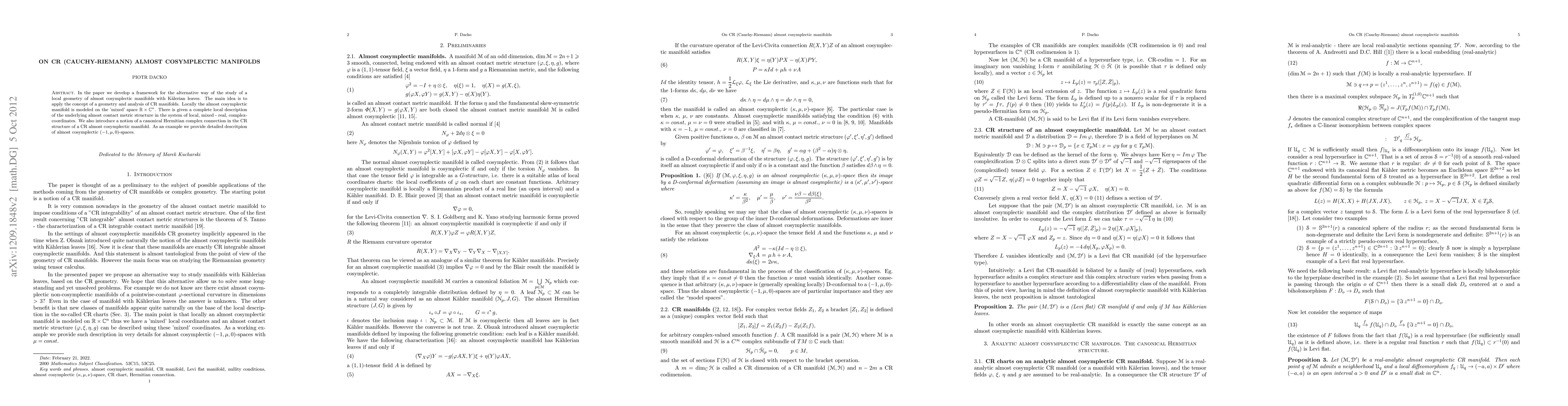 This paper develops a novel framework for studying the local geometry of almost cosymplectic manifolds with Kahlerian leaves using CR (Cauchy-Riemann) manifold concepts, modeled locally on the mixed space RxCn, and introduces a canonical Hermitian complex connection within the CR structure.