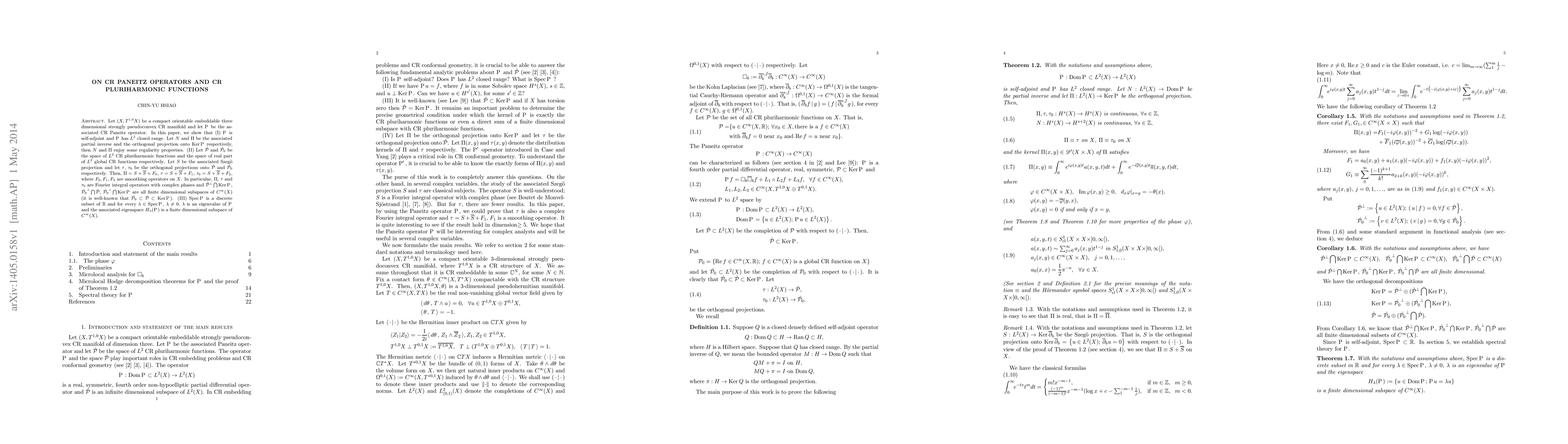 Let $(X,T^{1,0}X)$ be a compact orientable embeddable three dimensional strongly pseudoconvex CR manifold and let ${\rm P\,}$ be the associated CR Paneitz operator. In this paper, we show that (I) ${\rm P\,}$ is self-adjoint and ${\rm P\,}$ has $L^2$ closed range. Let $N$ and $\Pi$ be the associated partial inverse and the orthogonal projection onto ${\rm Ker\,}{\rm P\,}$ respectively, then $N$ and $\Pi$ enjoy some regularity properties. (II) Let $\hat{\mathcal{P}}$ and $\hat{\mathcal{P}_0}$ be the space of $L^2$ CR pluriharmonic functions and the space of real part of $L^2$ global CR functions respectively. Let $S$ be the associated Szeg\"o projection and let $\tau$, $\tau_0$ be the orthogonal projections onto $\hat{\mathcal{P}}$ and $\hat{\mathcal{P}_0}$ respectively. Then, $\Pi=S+\ol S+F_0$, $\tau=S+\ol S+F_1$, $\tau_0=S+\ol S+F_2$, where $F_0, F_1, F_2$ are smoothing operators on $X$. In particular, $\Pi$, $\tau$ and $\tau_0$ are Fourier integral operators with complex phases and $\hat{\mathcal{P}}^\perp\bigcap{\rm Ker\,}{\rm P\,}$, $\hat{\mathcal{P}_0}^\perp\bigcap\hat{\mathcal{P}}$, $\hat{\mathcal{P}_0}^\perp\bigcap{\rm Ker\,}{\rm P\,}$ are all finite dimensional subspaces of $C^\infty(X)$ (it is well-known that $\hat{\mathcal{P}_0}\subset\hat{\mathcal{P}}\subset{\rm Ker\,}{\rm P\,}$). (III) ${\rm Spec\,}{\rm P\,}$ is a discrete subset of $\Real$ and for every $\lambda\in{\rm Spec\,}{\rm P\,}$, $\lambda\neq0$, $\lambda$ is an eigenvalue of ${\rm P\,}$ and the associated eigenspace $H_\lambda({\rm P\,})$ is a finite dimensional subspace of $C^\infty(X)$.