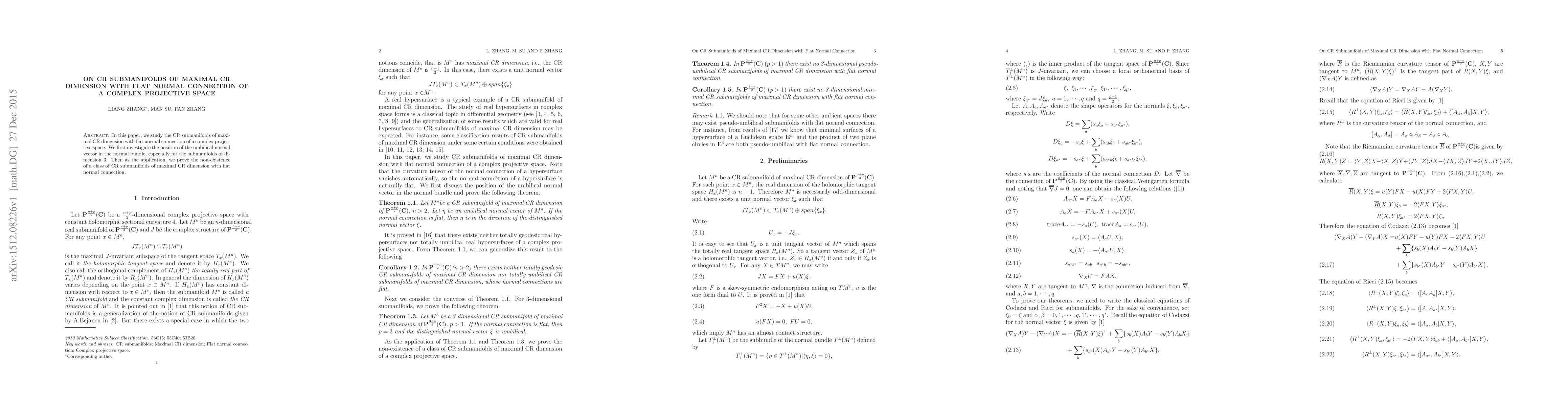 In this paper, we study the CR submanifolds of maximal CR dimension with flat normal connection of a complex projective space. We first investigate the position of the umbilical normal vector in the normal bundle, especially for the submanifolds of dimension 3. Then as the application, we prove the non-existence of a class of CR submanifolds of maximal CR dimension with flat normal connection.