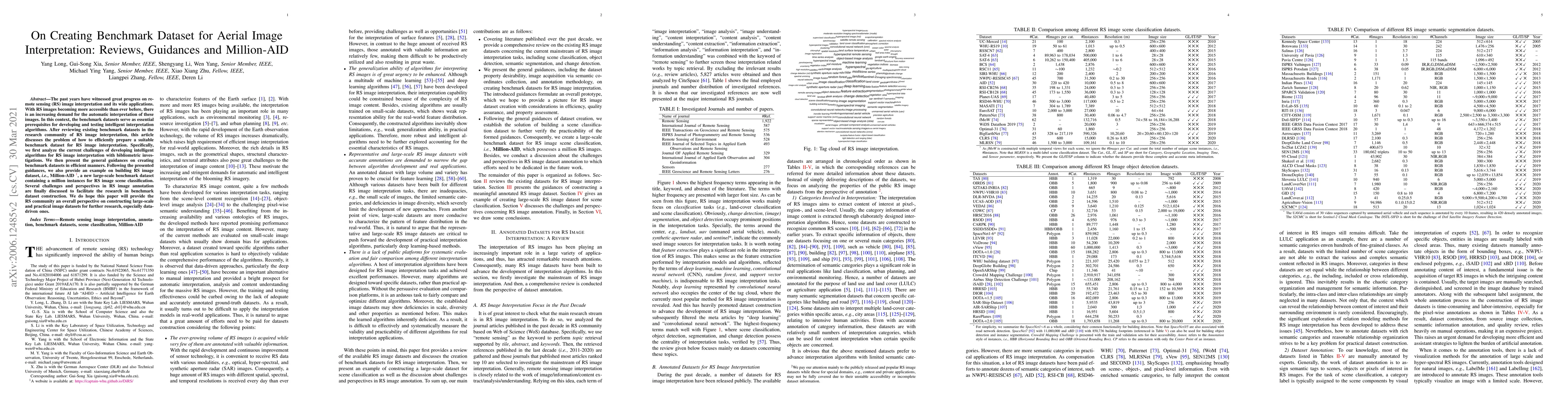This paper reviews existing benchmark datasets for remote sensing image interpretation, discusses challenges in developing intelligent algorithms, and provides guidelines for creating efficient benchmark datasets. It introduces Million-AID, a new large-scale dataset, and offers insights for future research in remote sensing image annotation.