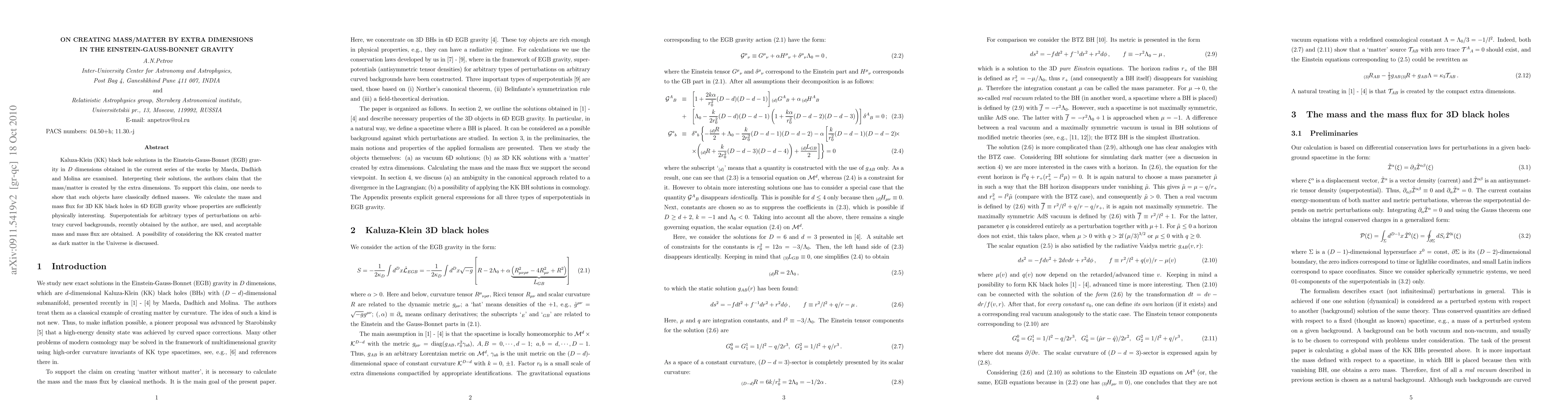 Kaluza-Klein (KK) black hole solutions in the Einstein-Gauss-Bonnet (EGB) gravity in $D$ dimensions obtained in the current series of the works by Maeda, Dadhich and Molina are examined. Interpreting their solutions, the authors claim that the mass/matter is created by the extra dimensions. To support this claim, one needs to show that such objects have classically defined masses. We calculate the mass and mass flux for 3D KK black holes in 6D EGB gravity whose properties are sufficiently physically interesting. Superpotentials for arbitrary types of perturbations on arbitrary curved backgrounds, recently obtained by the author, are used, and acceptable mass and mass flux are obtained. A possibility of considering the KK created matter as dark matter in the Universe is discussed.