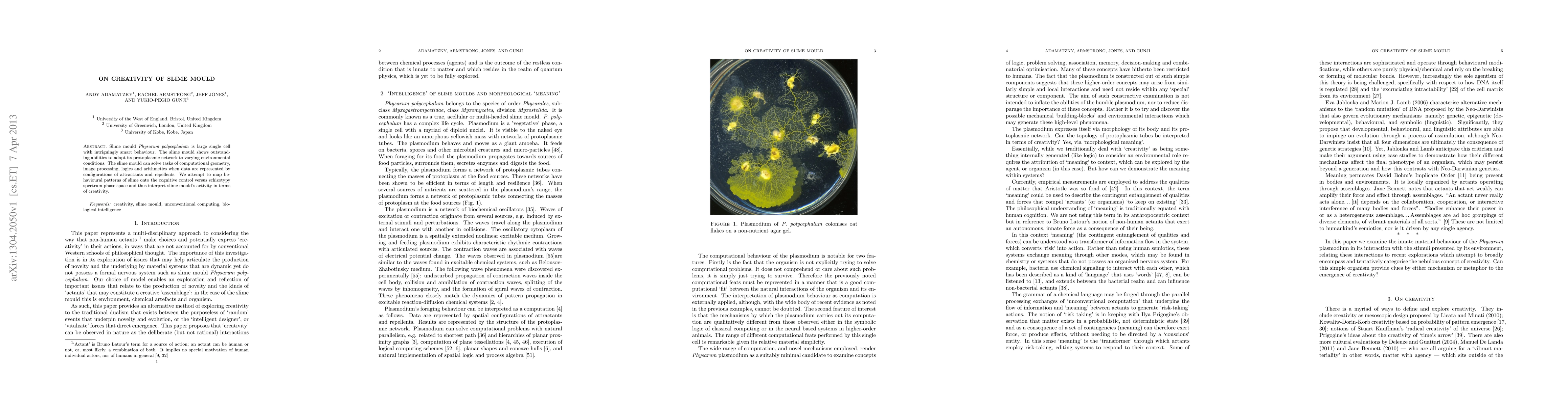 This paper explores the adaptive and problem-solving abilities of the slime mould Physarum polycephalum, demonstrating its capacity to tackle computational tasks through environmental interactions. The study aims to interpret the slime mould's behavior in terms of creativity by mapping its patterns to cognitive control and schizotypy spectrum.
