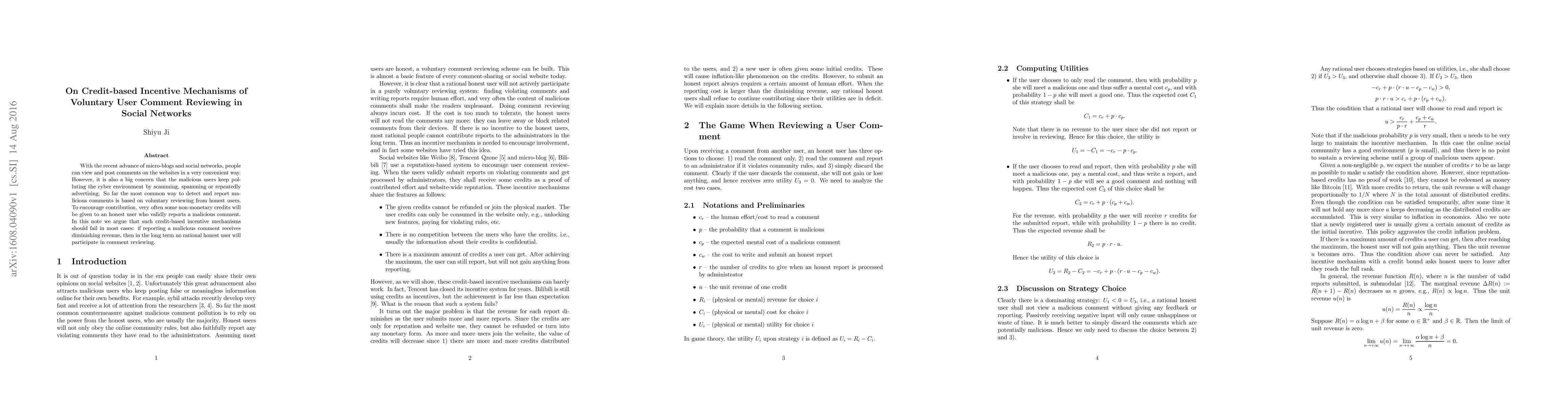 With the recent advance of micro-blogs and social networks, people can view and post comments on the websites in a very convenient way. However, it is also a big concern that the malicious users keep polluting the cyber environment by scamming, spamming or repeatedly advertising. So far the most common way to detect and report malicious comments is based on voluntary reviewing from honest users. To encourage contribution, very often some non-monetary credits will be given to an honest user who validly reports a malicious comment. In this note we argue that such credit-based incentive mechanisms should fail in most cases: if reporting a malicious comment receives diminishing revenue, then in the long term no rational honest user will participate in comment reviewing.