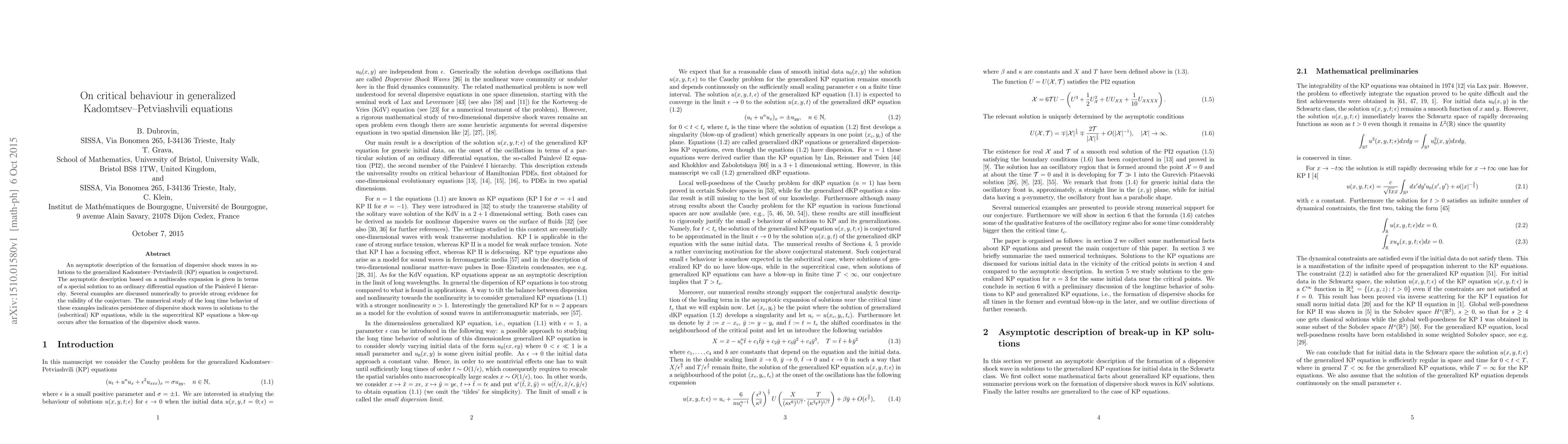 An asymptotic description of the formation of dispersive shock waves in solutions to the generalized Kadomtsev--Petviashvili (KP) equation is conjectured. The asymptotic description based on a multiscales expansion is given in terms of a special solution to an ordinary differential equation of the Painleve' I hierarchy. Several examples are discussed numerically to provide strong evidence for the validity of the conjecture.