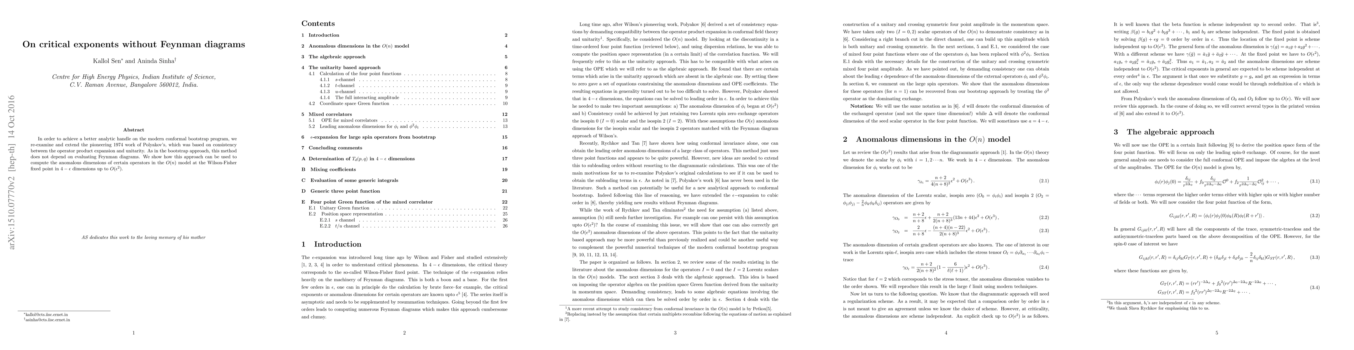 The research re-examines and extends Polyakov's 1974 work, focusing on consistency between the operator product expansion and unitarity, without relying on Feynman diagrams. This method is applied to compute anomalous dimensions of operators in the $O(n)$ model at the Wilson-Fisher fixed point in $4-\epsilon$ dimensions up to $O(\epsilon^2)$.