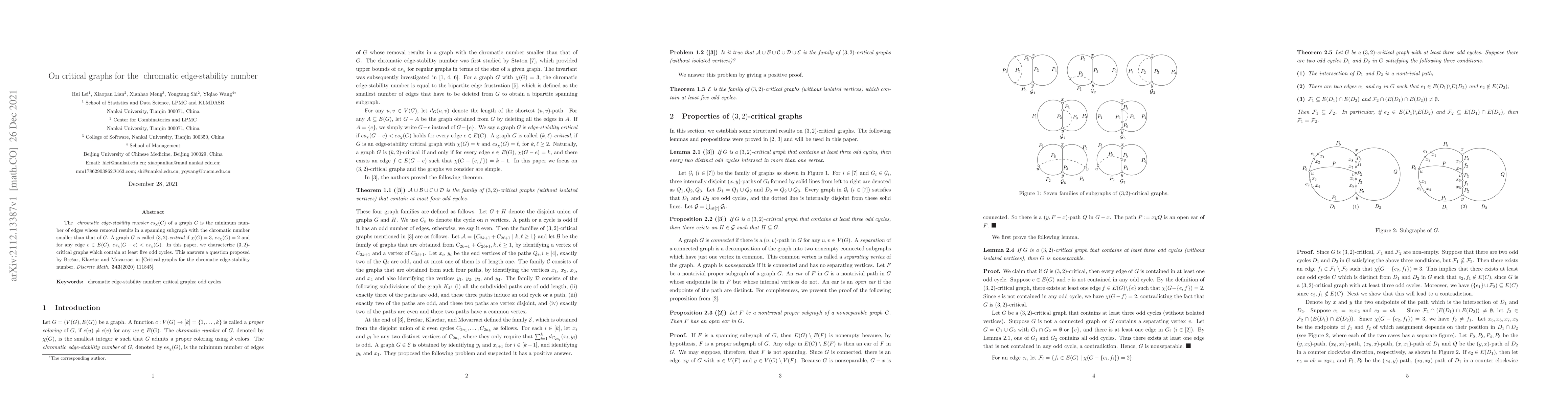The paper characterizes $(3,2)$-critical graphs containing at least five odd cycles by proving several theorems and lemmas, using graph theory concepts and techniques.