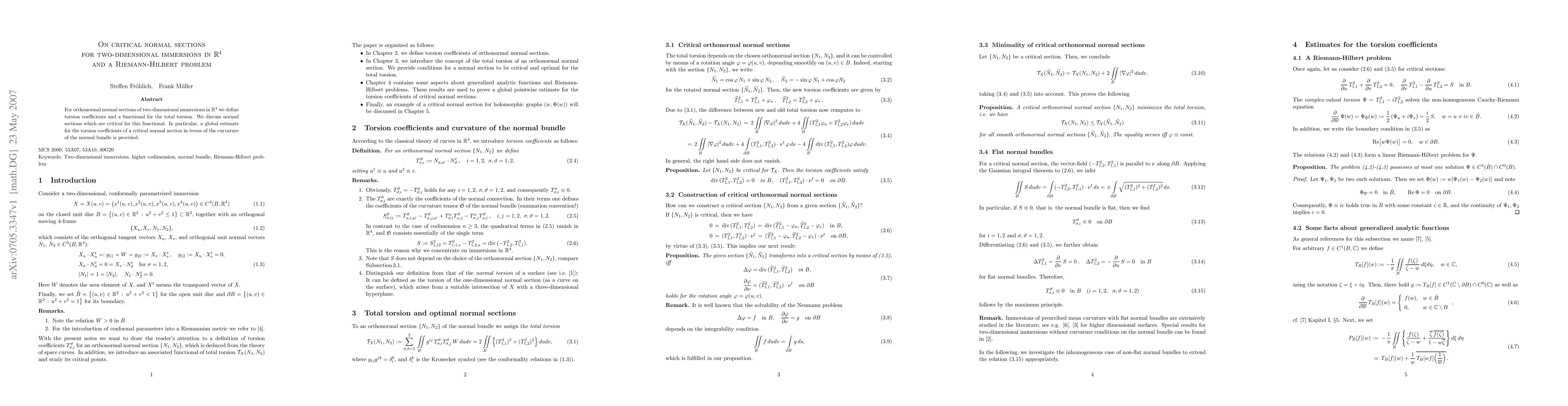 For orthonormal normal sections of two-dimensional immersions in R^4 we define torsion coefficients and a functional for the total torsion. We discuss normal sections which are critical for this functional. In particular, a global estimate for the torsion coefficients of a critical normal section in terms of the curvature of the normal bundle is provided.