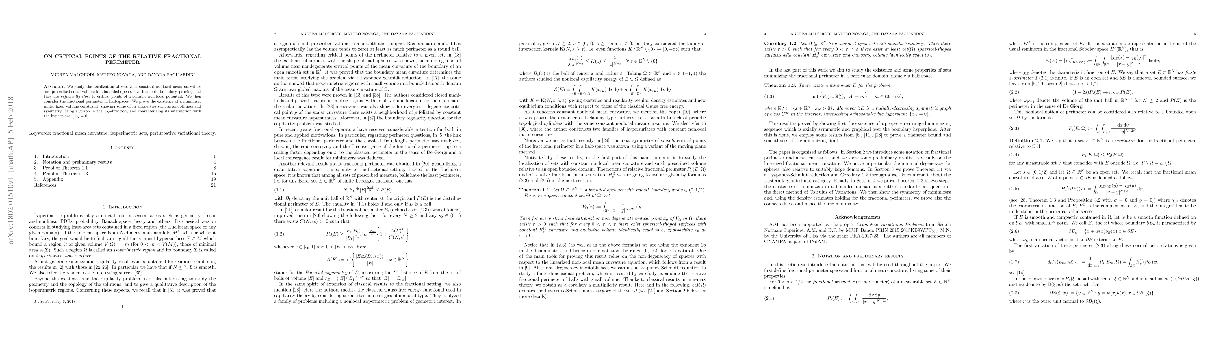 We study the localization of sets with constant nonlocal mean curvature and prescribed small volume in a bounded open set with smooth boundary, proving that they are {\em sufficiently close} to critical points of a suitable non-local potential. We then consider the fractional perimeter in half-spaces. We prove the existence of a minimizer under fixed volume constraint, showing some of its properties such as smoothness and symmetry, being a graph in the $x_N$-direction, and characterizing its intersection with the hyperplane $\{x_N=0\}$.