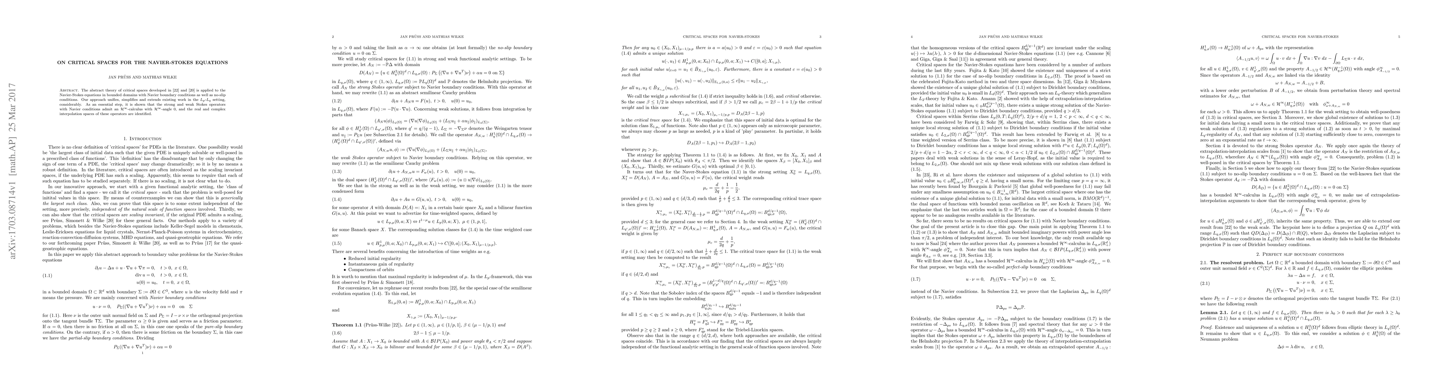This paper applies the theory of critical spaces to the Navier-Stokes equations in bounded domains, unifying and simplifying existing $L_p$-$L_q$ results. It demonstrates that the Stokes operators with Navier conditions possess an $\mathcal{H}^\infty$-calculus, facilitating the identification of real and complex interpolation spaces.