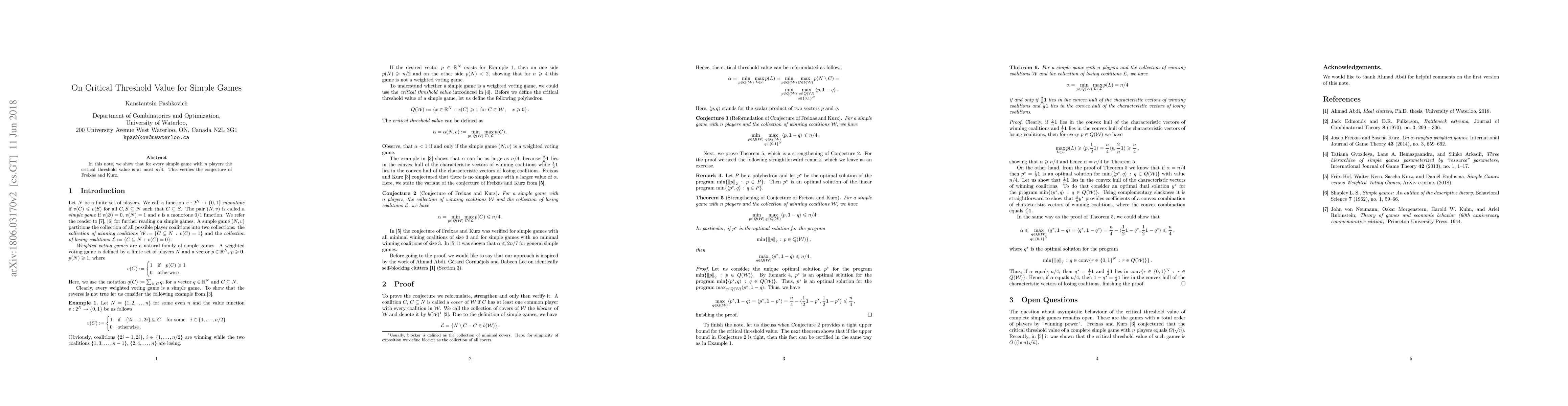 Researchers prove that the critical threshold value for simple games with n players is at most n/4, verifying a long-standing conjecture.