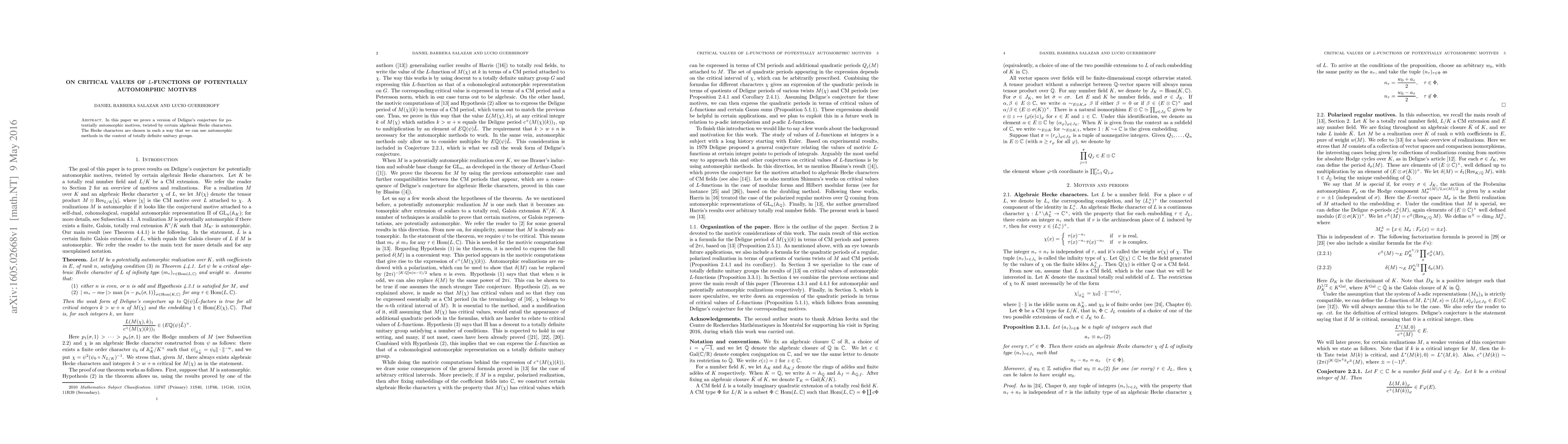 Summary: This paper proves a variant of Deligne's conjecture for potentially automorphic motives, employing automorphic methods linked to algebraic Hecke characters and totally definite unitary groups. The focus is on critical values of L-functions associated with these motives.