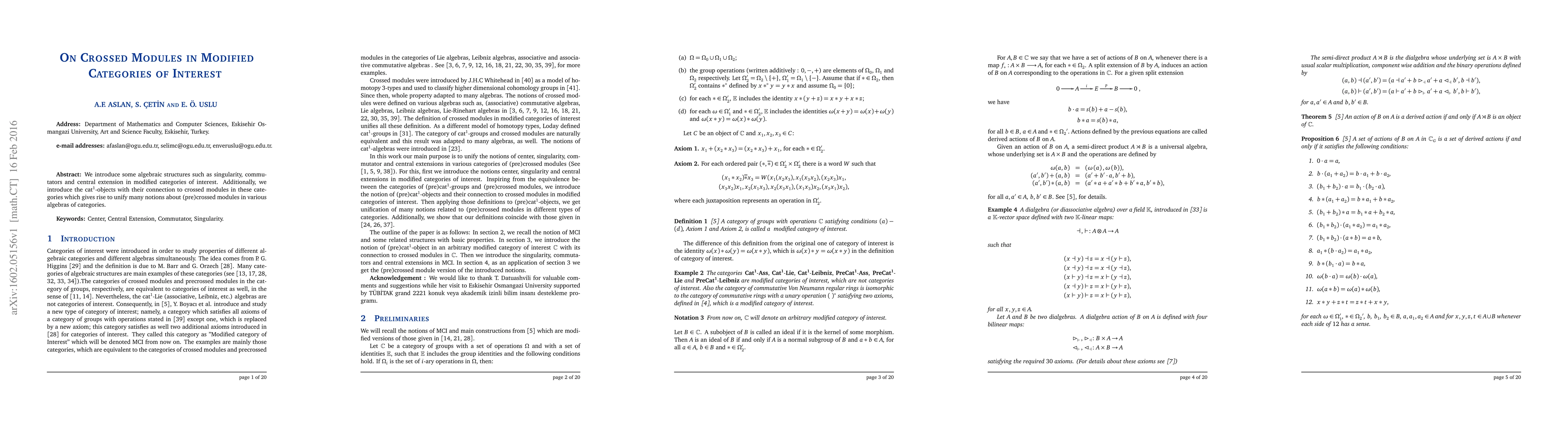 We introduce some algebraic structures such as singularity, commutators and central extension in modified categories of interest. Additionally, we introduce the cat$^{1}$-objects with their connection to crossed modules in these categories which gives rise to unify many notions about (pre)crossed modules in various algebras of categories.