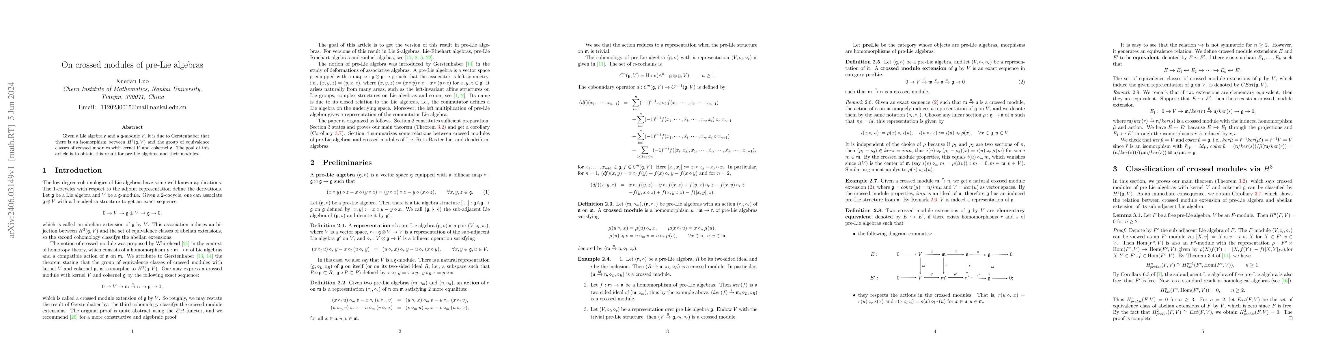 This paper explores the isomorphism between $H^3(\mathfrak{g}, V)$ and the group of equivalence classes of crossed modules for pre-Lie algebras and their modules, extending Gerstenhaber's result from Lie algebras to pre-Lie algebras.