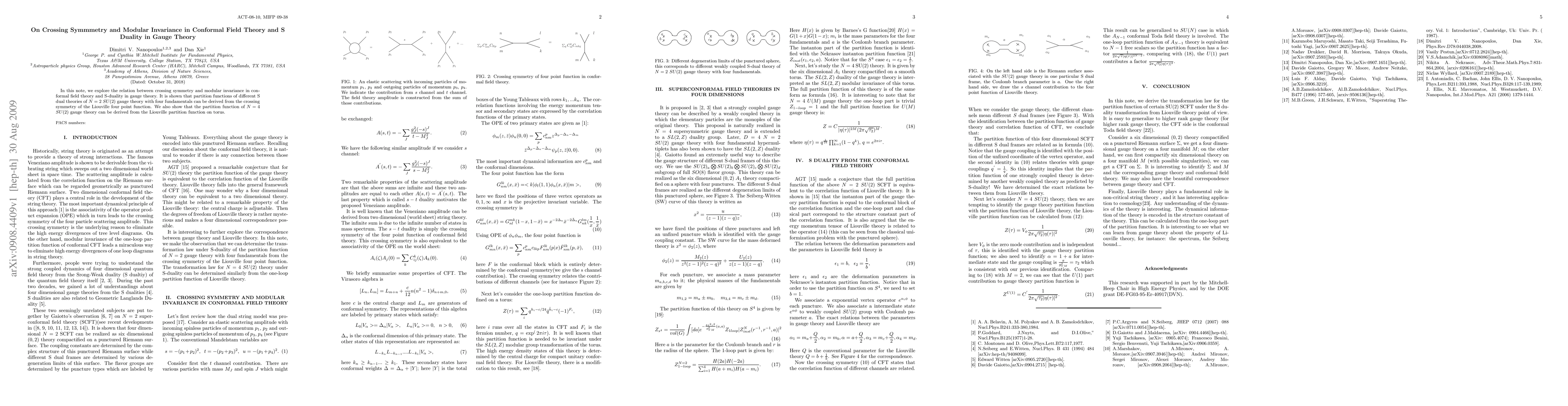 In this note, we explore the relation between crossing symmetry and modular invariance in conformal field theory and S-duality in gauge theory. It is shown that partition functions of different S dual theories of N=2 SU(2) gauge theory with four fundamentals can be derived from the crossing symmetry of the Liouville four point function. We also show that the partition function of N=4 SU(2) gauge theory can be derived from the Liouville partition function on torus.