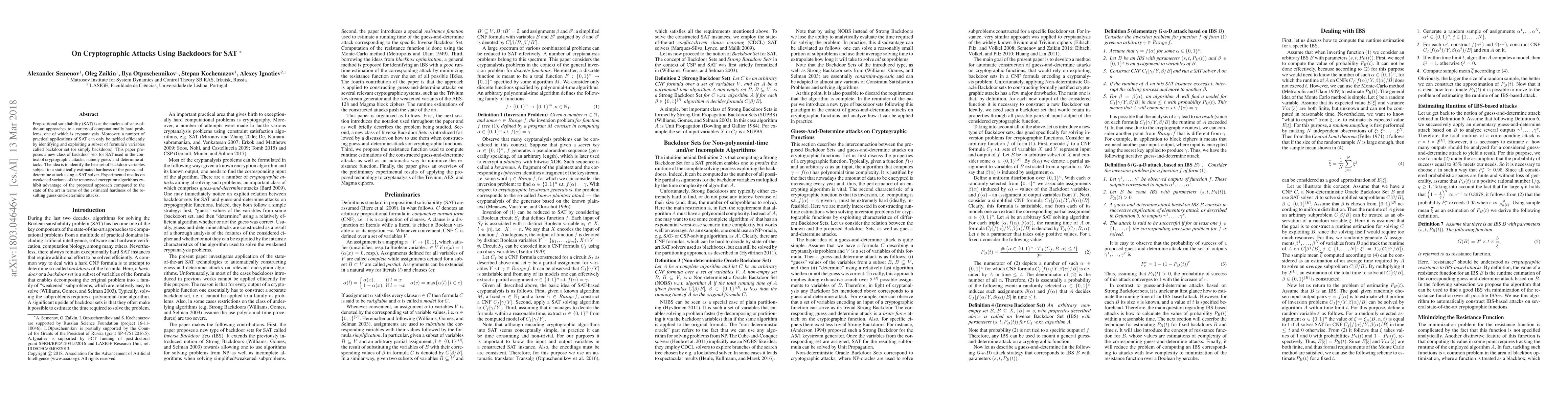 Propositional satisfiability (SAT) is at the nucleus of state-of-the-art approaches to a variety of computationally hard problems, one of which is cryptanalysis. Moreover, a number of practical applications of SAT can only be tackled efficiently by identifying and exploiting a subset of formula's variables called backdoor set (or simply backdoors). This paper proposes a new class of backdoor sets for SAT used in the context of cryptographic attacks, namely guess-and-determine attacks. The idea is to identify the best set of backdoor variables subject to a statistically estimated hardness of the guess-and-determine attack using a SAT solver. Experimental results on weakened variants of the renowned encryption algorithms exhibit advantage of the proposed approach compared to the state of the art in terms of the estimated hardness of the resulting guess-and-determine attacks.
