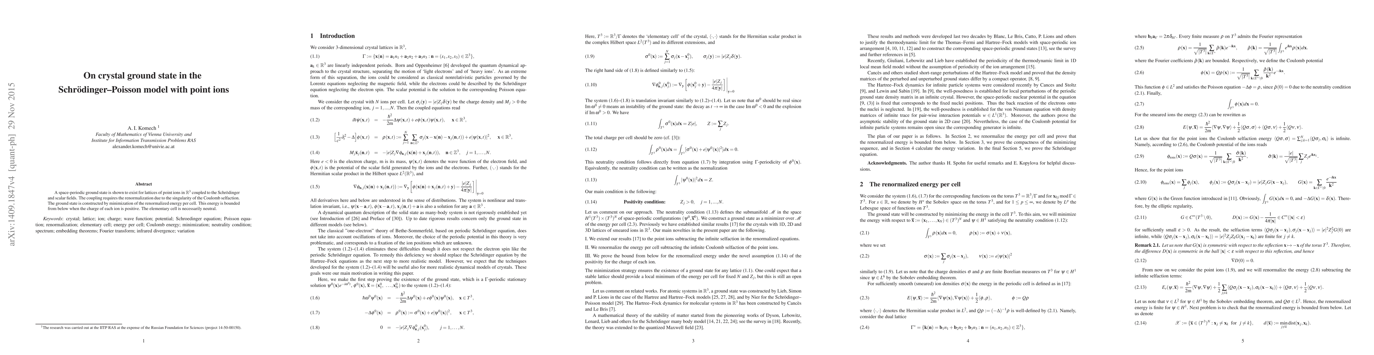 The paper demonstrates the existence of a space-periodic ground state for lattices of positive point ions in three-dimensional space, coupled to Schrödinger and scalar fields. This is achieved by renormalizing the self-action due to the Coulomb potential's singularity, and constructing the ground state via energy minimization per cell, which is shown to be bounded from below, ensuring a neutral elementary cell.