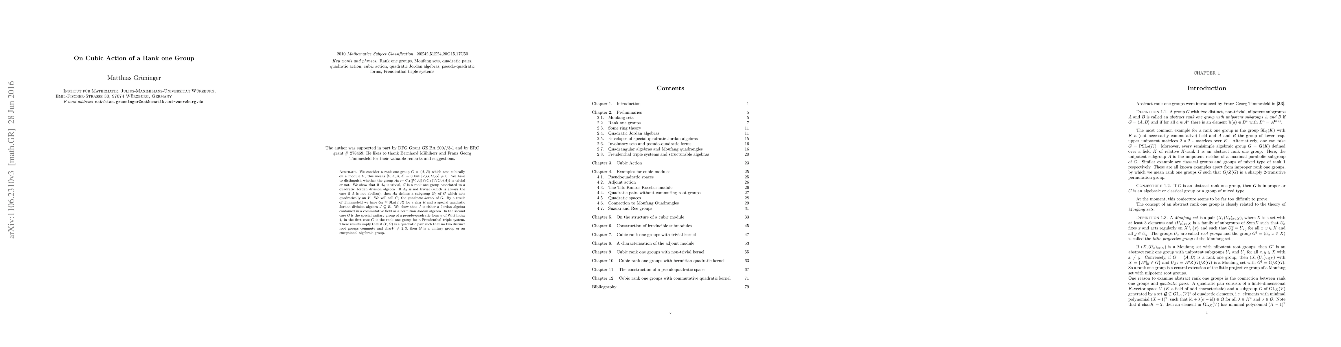 We consider a rank one group $G = \langle A,B \rangle $ which acts cubically on a module $V$, this means $[V,A,A,A] =0$ but $[V,G,G,G] \ne 0$. We have to distinguish whether the group $A_0 :=C_A([V,A]) \cap C_A(V/C_V(A))$ is trivial or not. We show that if $A_0$ is trivial, $G$ is a rank one group associated to a quadratic Jordan division algebra. If $A_0$ is not trivial (which is always the case if $A$ is not abelian), then $A_0$ defines a subgroup $G_0$ of $G$ which acts quadratically on $V$. We will call $G_0$ the \textit{quadratic kernel} of $G$. By a result of Timmesfeld we have $G_0 \cong \SL_2(J,R)$ for a ring $R$ and a special quadratic Jordan division algebra $J \subseteq R$. We show that $J$ is either a Jordan algebra contained in a commutative field or a hermitian Jordan algebra. In the second case $G$ is the special unitary group of a pseudo-quadratic form $\pi$ of Witt index $1$, in the first case $G$ is the rank one group for a Freudenthal triple system. These results imply that if $(V,G)$ is a quadratic pair such that no two distinct root groups commute and $\characteristic V\ne 2,3$, then $G$ is a unitary group or an exceptional algebraic group.
