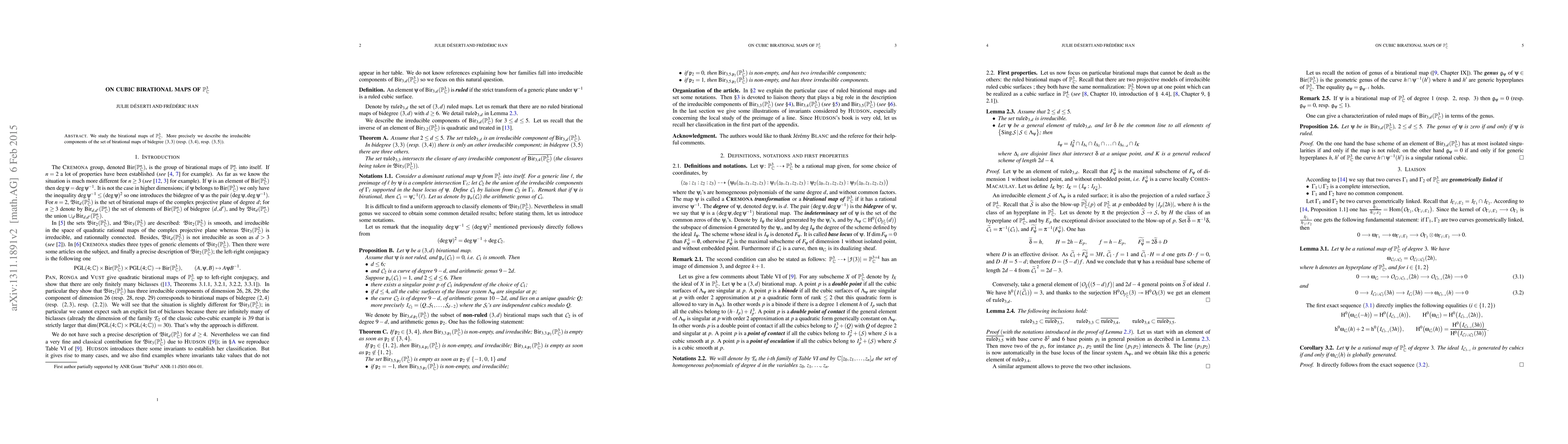 We study the birational maps of $\mathbb{P}^3_\mathbb{C}$. More precisely we describe the irreducible components of the set of birational maps of bidegree $(3,3)$ (resp. $(3,4)$, resp. $(3,5)$).