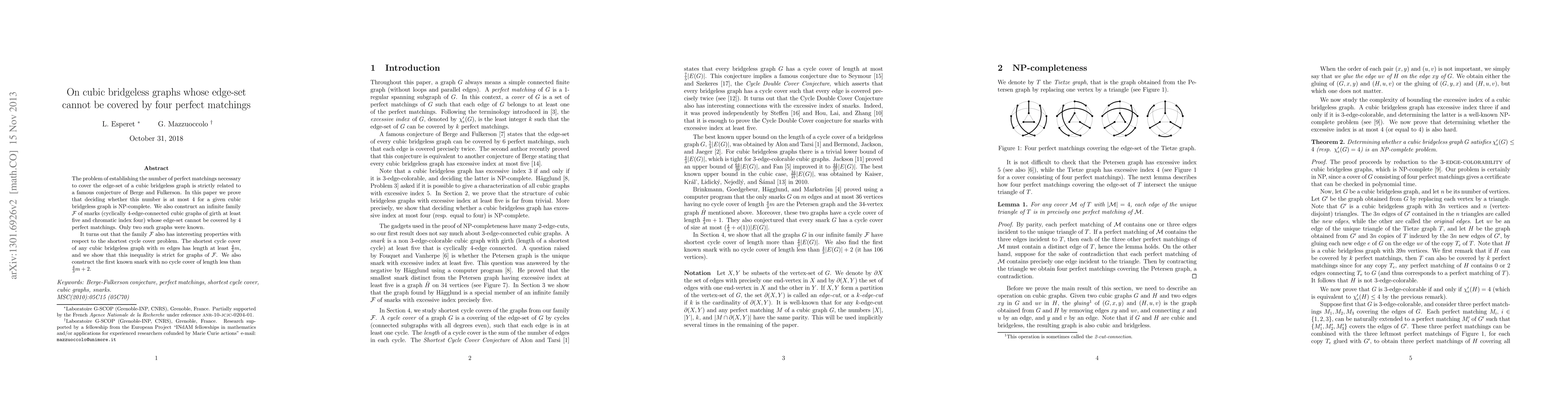 Summary: This paper proves that determining if a cubic bridgeless graph's edge-set can be covered by four perfect matchings is NP-complete and introduces an infinite family of snarks that cannot be covered by four perfect matchings, enhancing understanding of the problem's complexity.