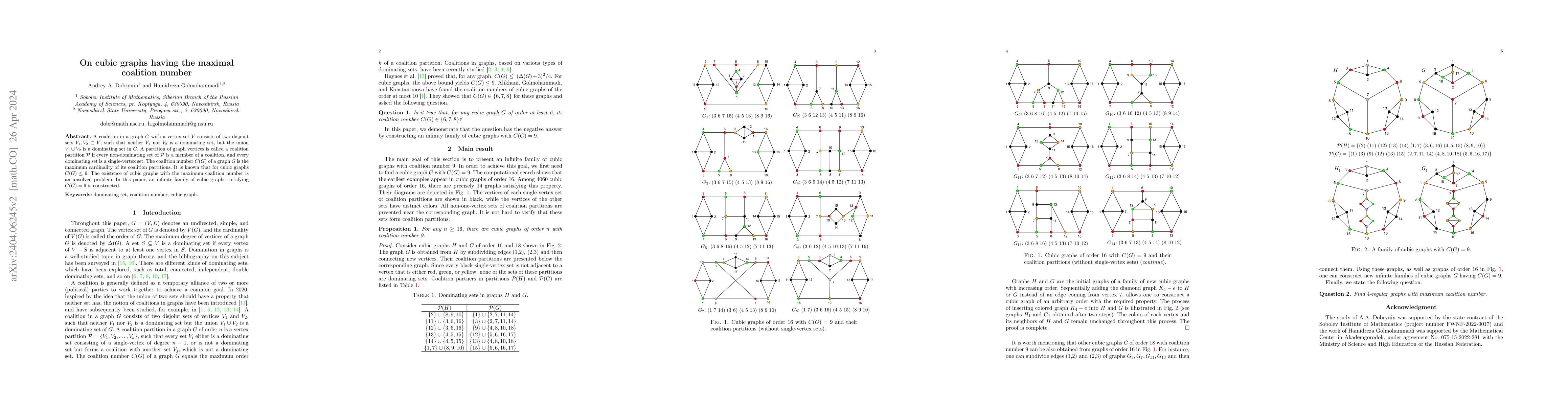 This paper constructs an infinite family of cubic graphs where the maximal coalition number, $C(G)$, equals 9, addressing an unsolved problem regarding the existence of such graphs. The study explores coalition partitions in these graphs and their properties.