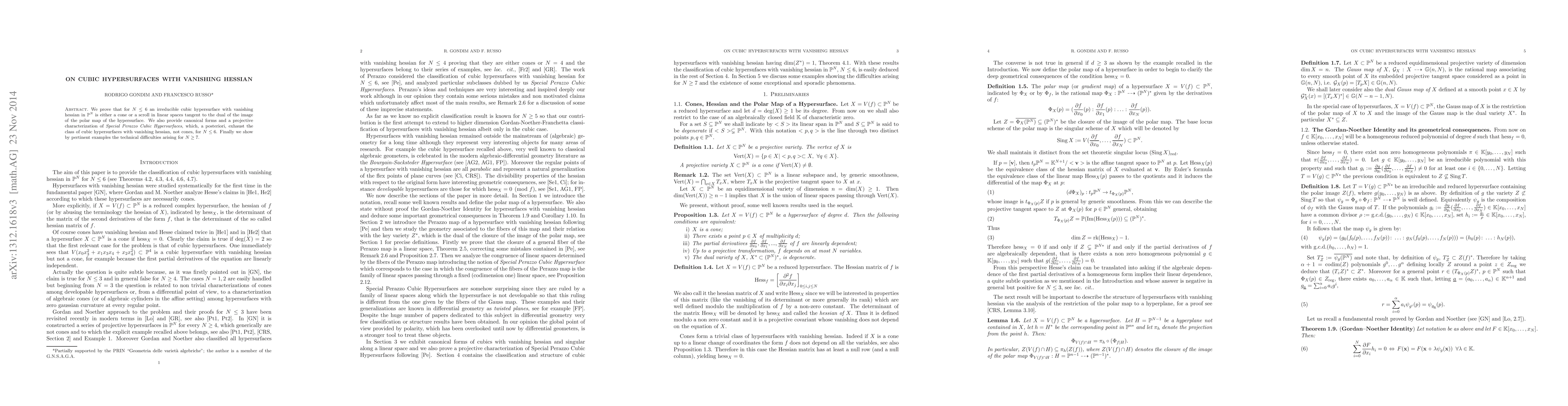 If $X = V(f) \subset \mathbb P^N$ is a reduced complex hypersurface, the hessian of $f$ (or by abusing the terminology the hessian of $X$) is the determinant of the matrix of the second derivatives of the form $f$, that is the determinant of the hessian matrix of $f$. Hypersurfaces with vanishing hessian were studied systematically for the first time in the fundamental paper [GN], where Gordan and M. Noether analyze Hesse's claims in [Hesse1, Hesse2] according to which these hypersurfaces are necessarily cones. Of course cones have vanishing hessian. Clearly the claim is true if deg(X)=2 so that the first relevant case for the problem is that of cubic hypersurfaces. One immediately sees that $V(x_0x_3^2 + x_1x_3x_4 + x_2x_4^2)\subset \mathbb P^4$ is a cubic hypersurface with vanishing hessian but not a cone (for example one could check that the first partial derivatives of the equation are linearly independent). As firstly pointed out in [GN], the claim is true for $N\leq 3$ and in general false for every $N\geq 4$. Here we prove that for $N\leq 6$ an irreducible cubic hypersurface with vanishing hessian in $\mathbb P^N$ is either a cone or a scroll in linear spaces tangent to the dual of the image of the polar map of the hypersurface. We also provide canonical forms and a projective characterization of {\it Special Perazzo Cubic Hypersurfaces}, which, a posteriori, exhaust the class of cubic hypersurfaces with vanishing hessian, not cones, for $N\leq 6$. Finally we show by pertinent examples the technical difficulties arising for $N\geq 7$.