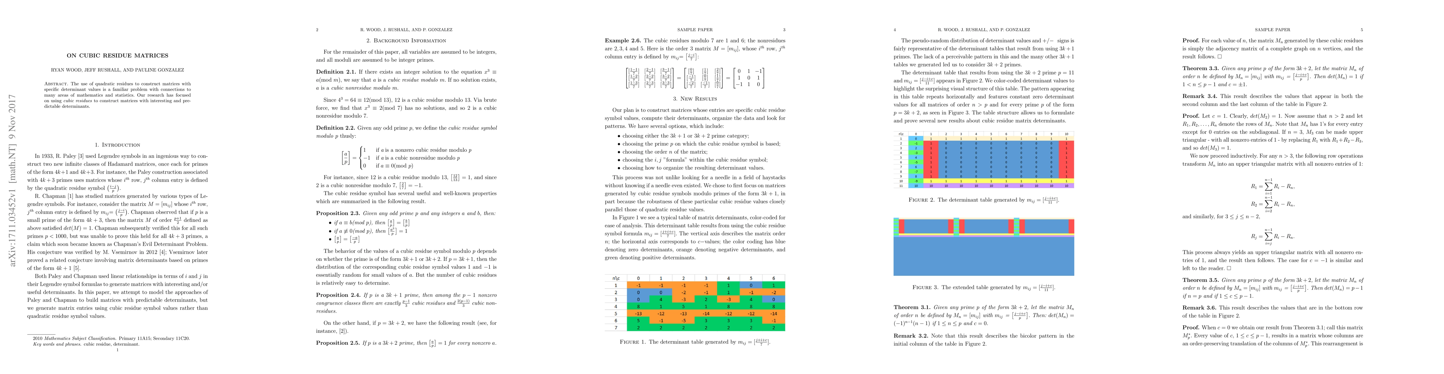 Summary: This paper explores the construction of matrices using cubic residues to achieve specific determinant values, highlighting connections to various mathematical and statistical fields. The study aims to predict and analyze the determinants of these matrices.