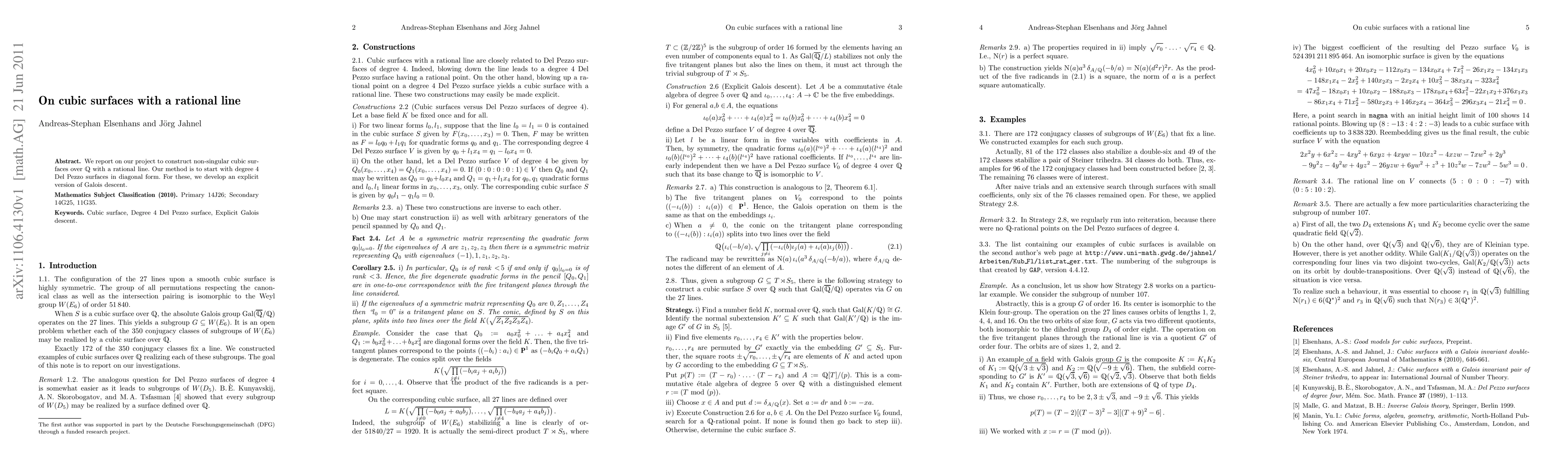 We report on our project to construct non-singular cubic surfaces over $\bbQ$ with a rational line. Our method is to start with degree 4 Del Pezzo surfaces in diagonal form. For these, we develop an explicit version of Galois descent.