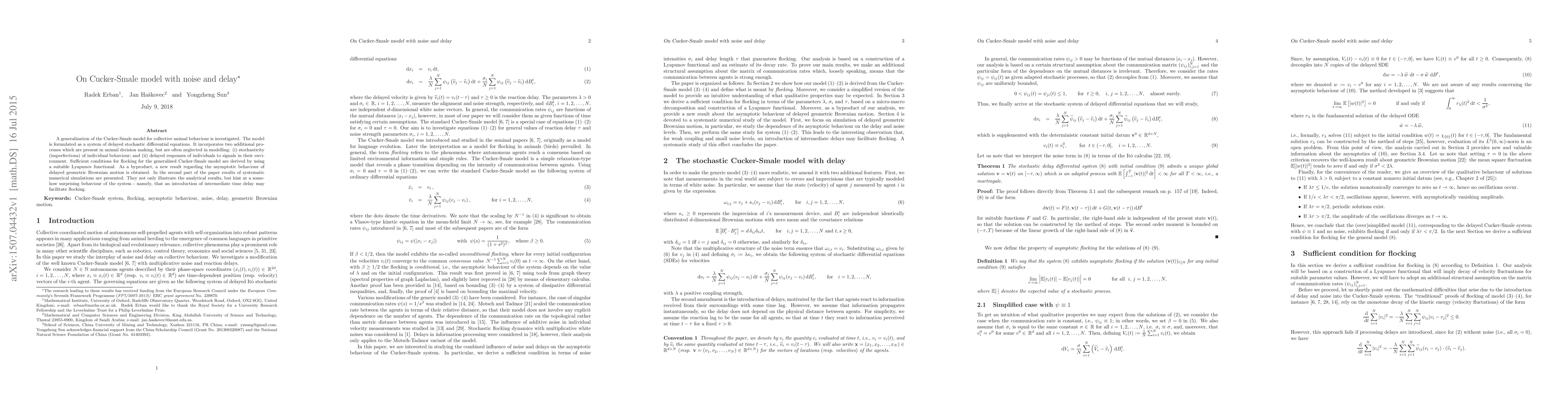 This paper generalizes the Cucker-Smale model for collective animal behaviour by incorporating stochasticity and delayed responses, formulated as delayed stochastic differential equations. Analytical results show sufficient conditions for flocking, and numerical simulations reveal that intermediate time delays may enhance flocking.