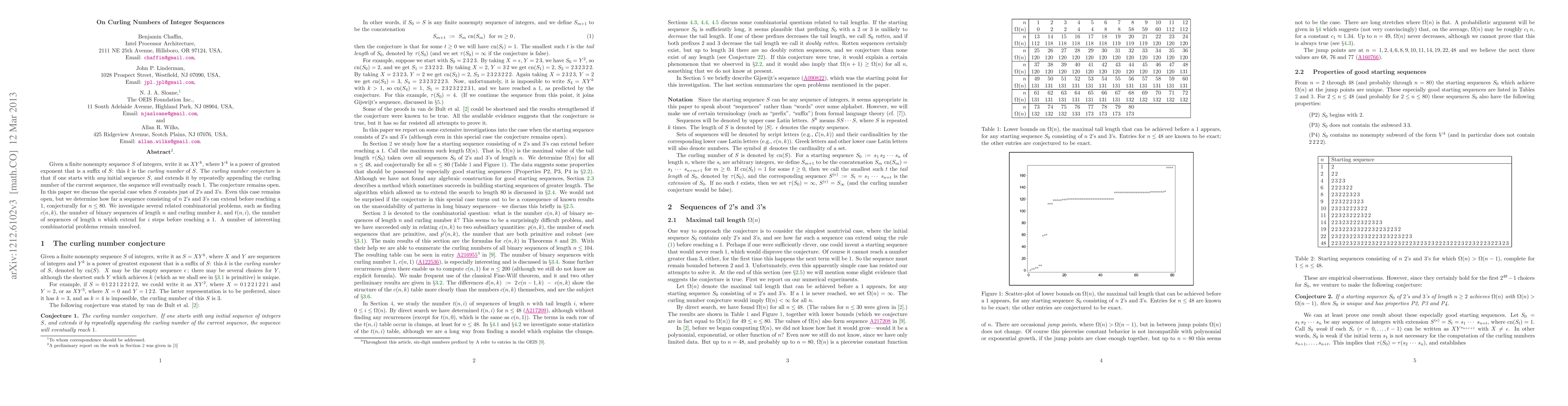 Given a finite nonempty sequence S of integers, write it as XY^k, where Y^k is a power of greatest exponent that is a suffix of S: this k is the curling number of S. The Curling Number Conjecture is that if one starts with any initial sequence S, and extends it by repeatedly appending the curling number of the current sequence, the sequence will eventually reach 1. The conjecture remains open. In this paper we discuss the special case when S consists just of 2's and 3's. Even this case remains open, but we determine how far a sequence of n 2's and 3's can extend before reaching a 1, conjecturally for n <= 80. We investigate several related combinatorial problems, such as finding c(n,k), the number of binary sequences of length n and curling number k, and t(n,i), the number of sequences of length n which extend for i steps before reaching a 1. A number of interesting combinatorial problems remain unsolved.