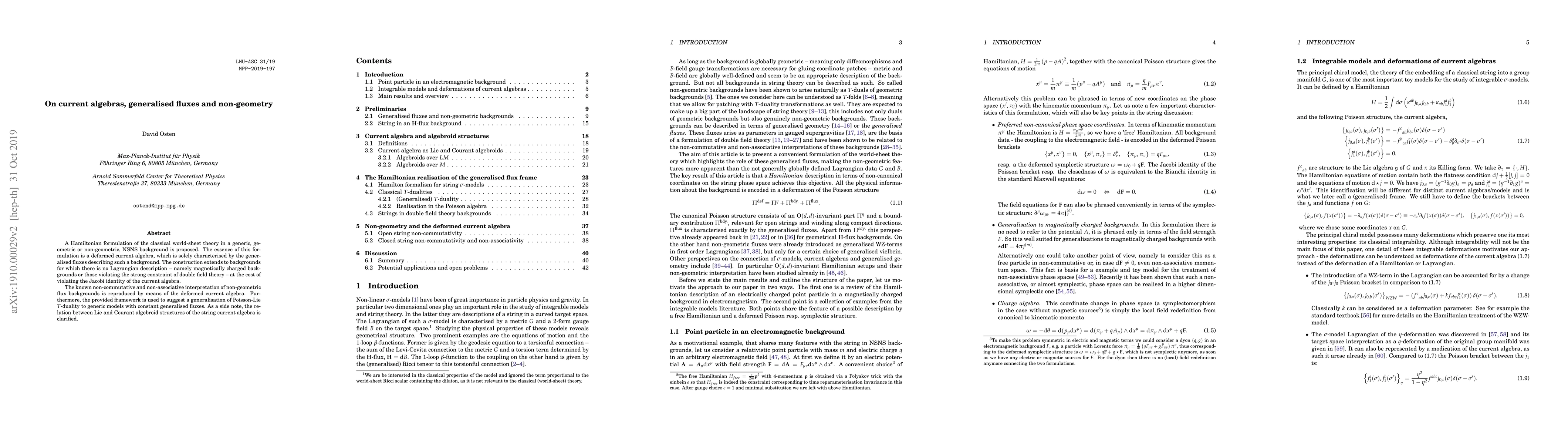 A Hamiltonian formulation of the classical world-sheet theory in a generic, geometric or non-geometric, NSNS background is proposed. The essence of this formulation is a deformed current algebra, which is solely characterised by the generalised fluxes describing such a background. The construction extends to backgrounds for which there is no Lagrangian description -- namely magnetically charged backgrounds or those violating the strong constraint of double field theory -- at the cost of violating the Jacobi identity of the current algebra. The known non-commutative and non-associative interpretation of non-geometric flux backgrounds is reproduced by means of the deformed current algebra. Furthermore, the provided framework is used to suggest a generalisation of Poisson-Lie $T$-duality to generic models with constant generalised fluxes. As a side note, the relation between Lie and Courant algebroid structures of the string current algebra is clarified.