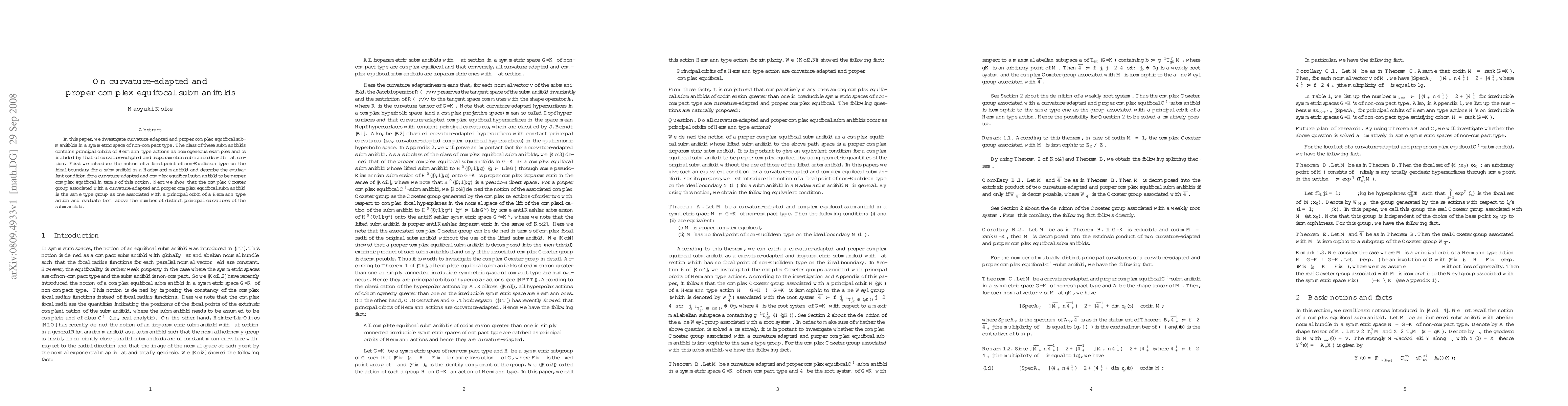 In this paper, we investigate a curvature-adapted and proper complex equifocal submanifold in a symmetric space of non-compact type. The class of these submanifolds contains principal orbits of Hermann type actions as homogeneous examples. In future, the results in this paper will be used to give a submanifold geometrical characterization of principal orbits of Hermann type actions.